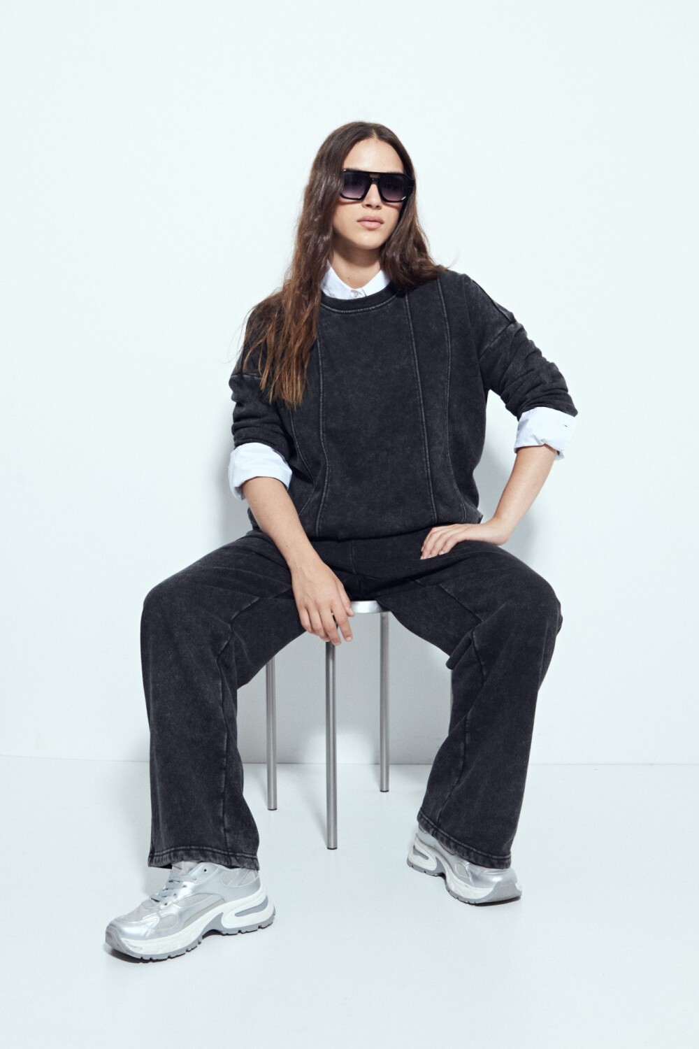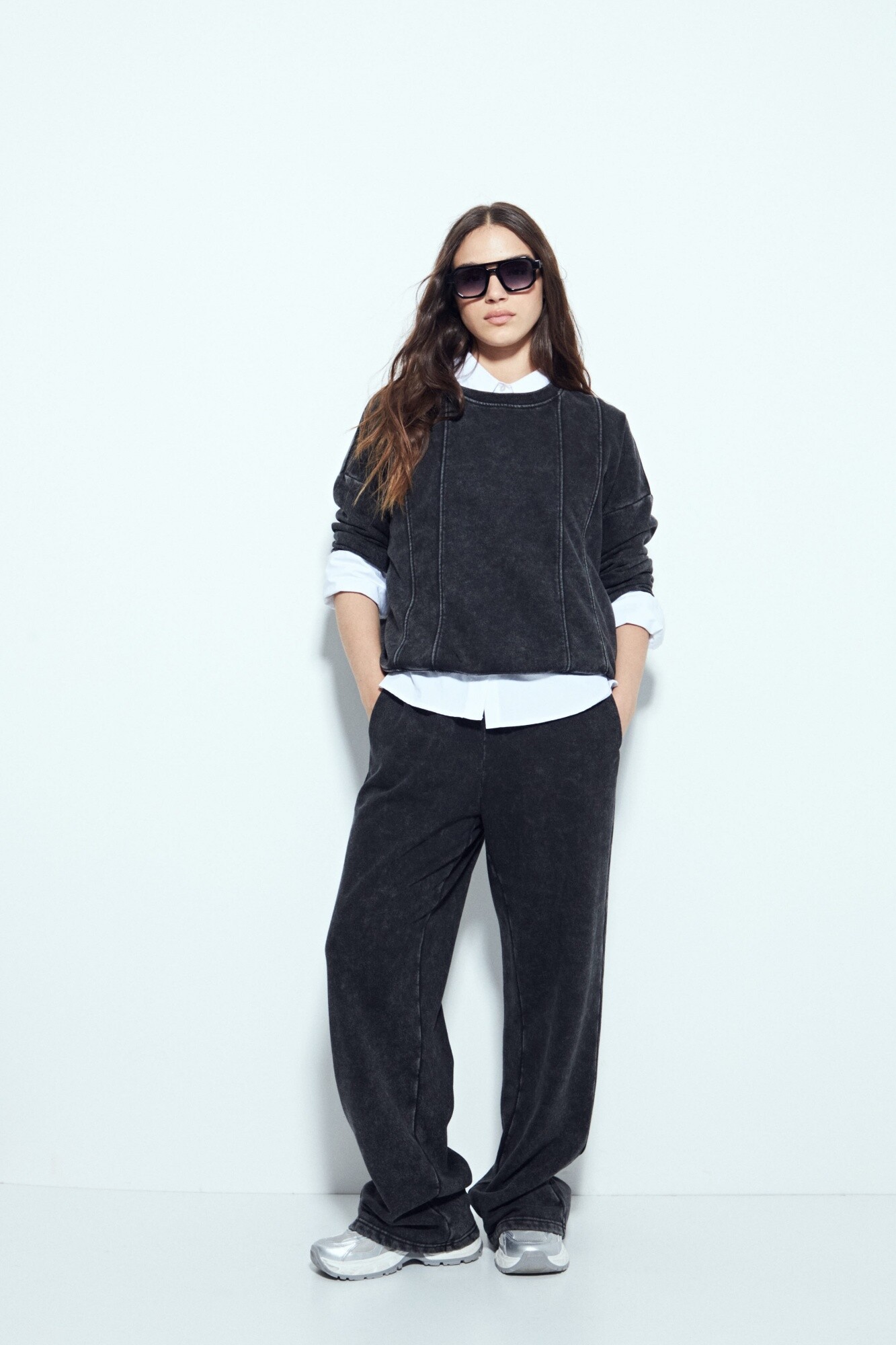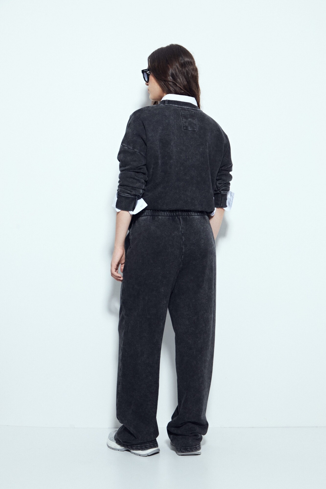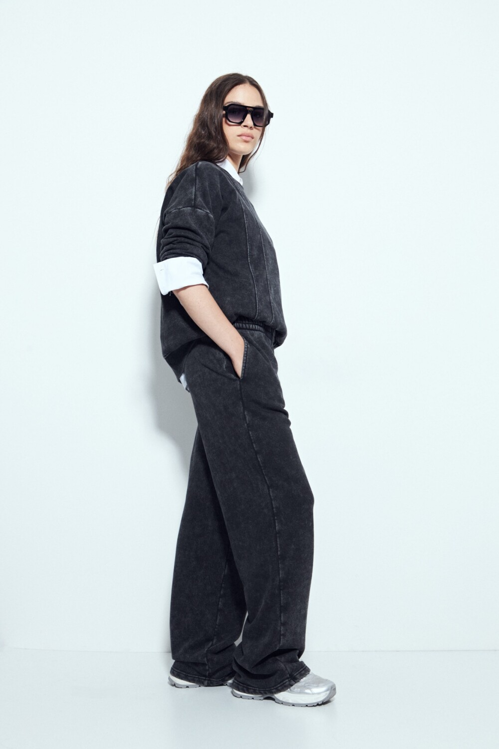 Babucha recta con elástica en la cintura y bolsillos en los laterales, de tela washed dyed que le proporciona ese color desgastado, lavado.