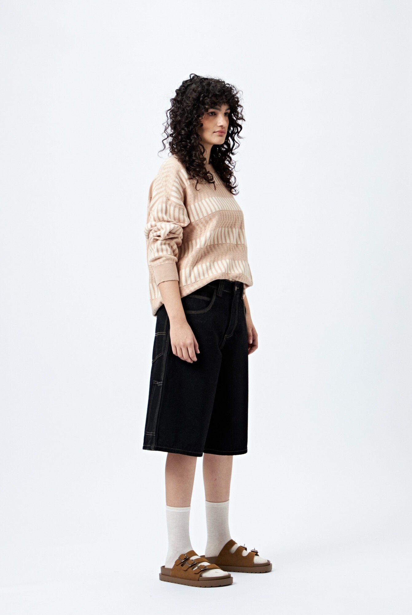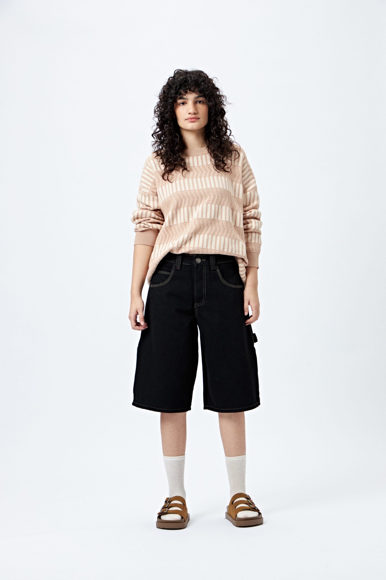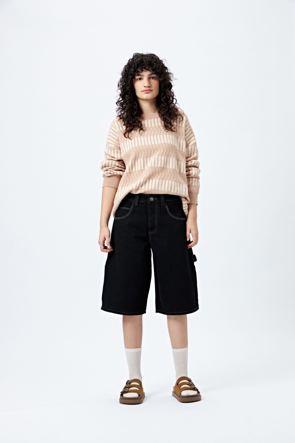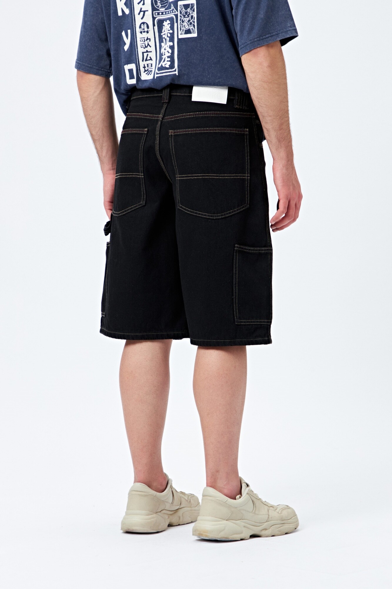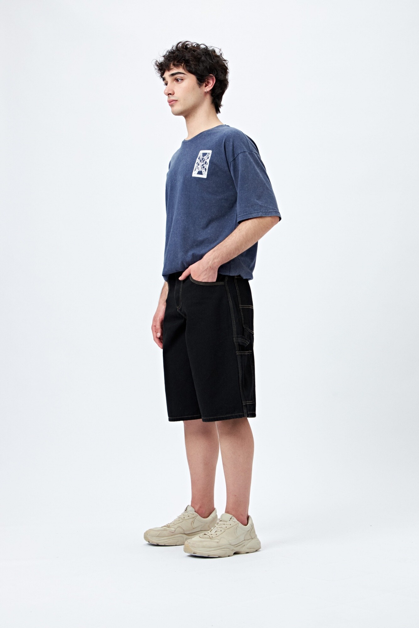 Bermuda carpenter de denim con fit relaxed y largo por encima de la rodilla. Con costuras visibles y múltiples bolsillos funcionales, aporta ese aire utilitario que la hace trendy y canchera. Una prenda sin género, pensada para todos los estilos.