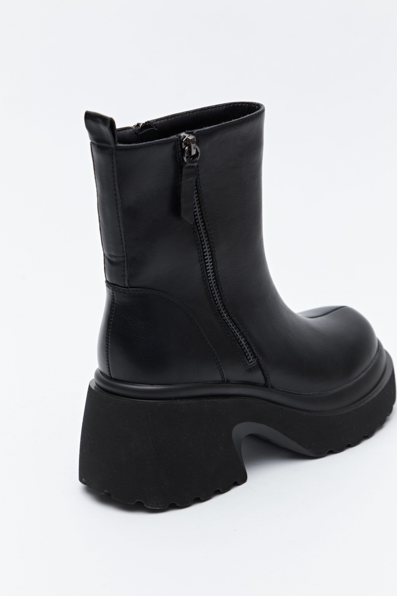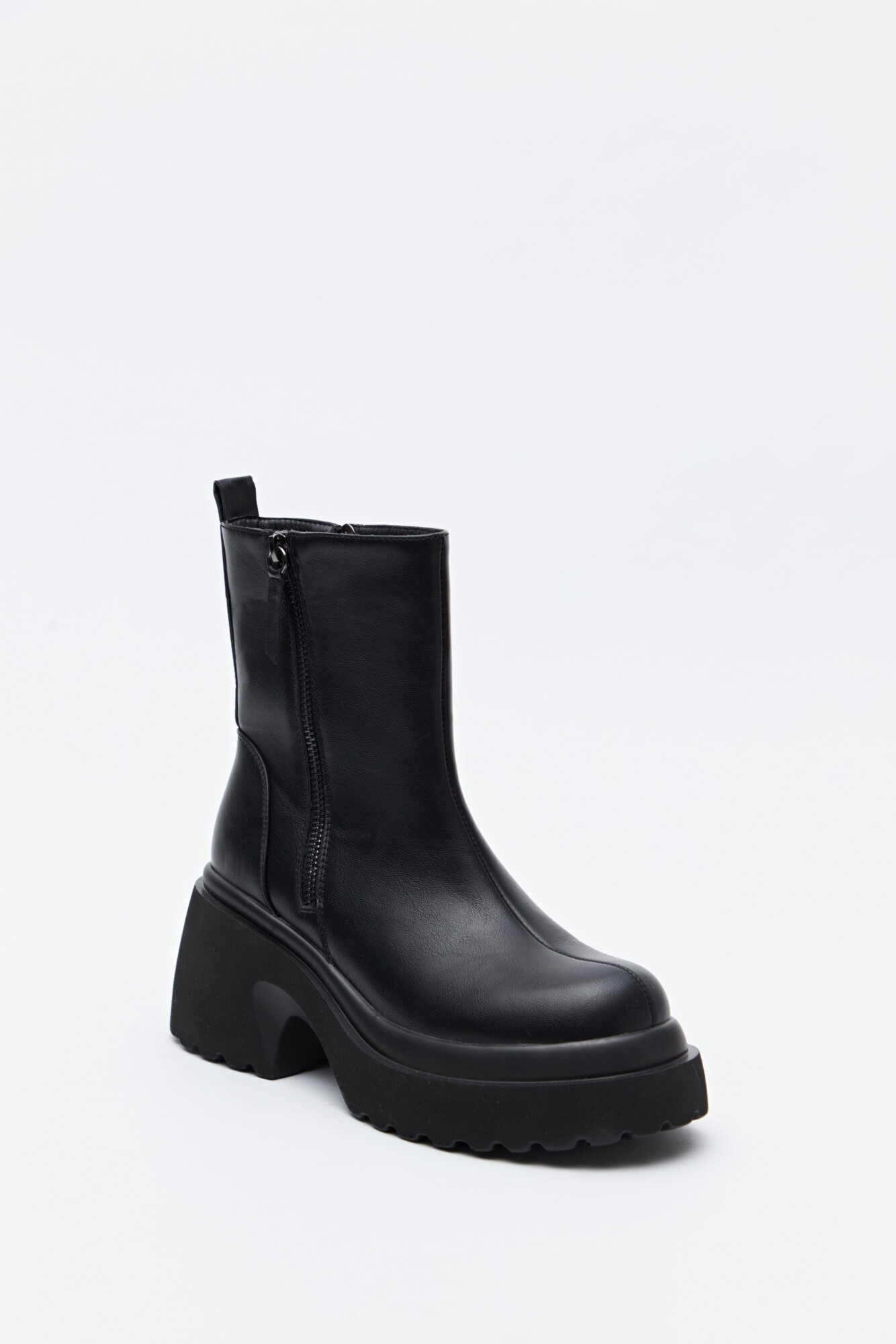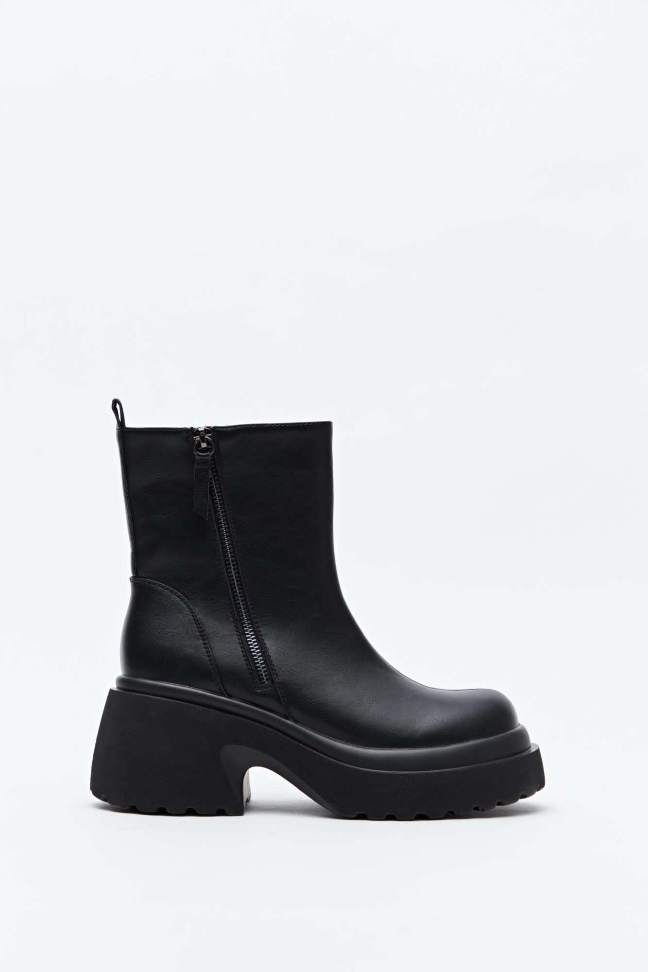 Bota de caña media con plataforma de líneas minimalistas y silueta contundente. Su diseño incorpora cierre lateral para un calce práctico y una base elevada con suela dentada que estiliza y aporta actitud.