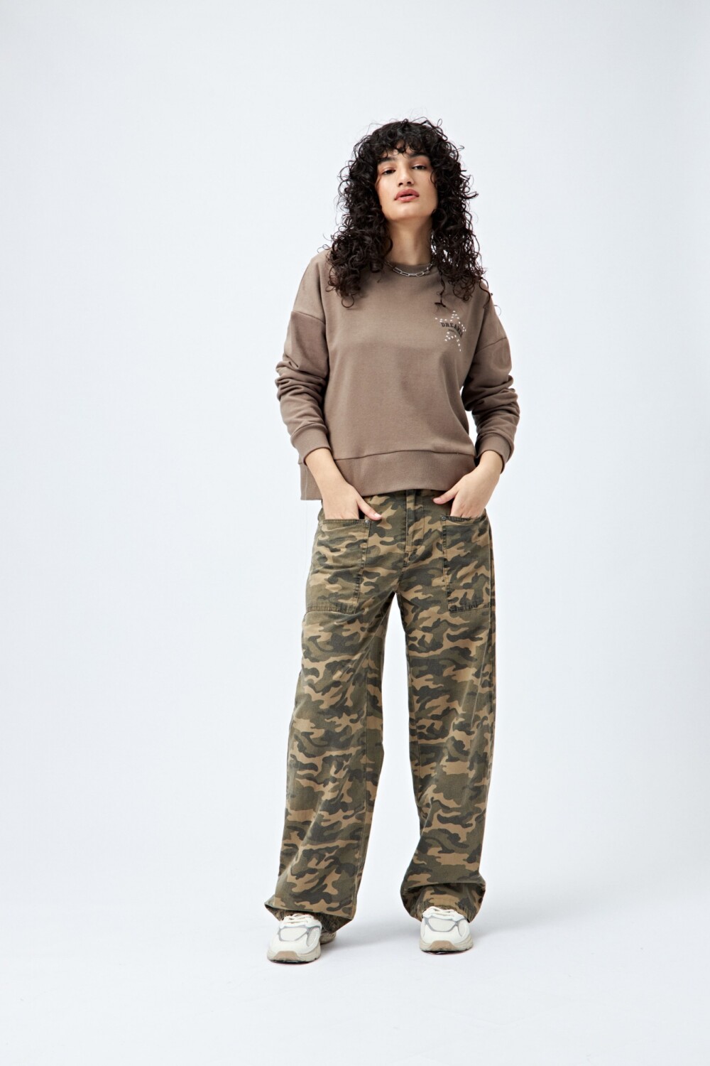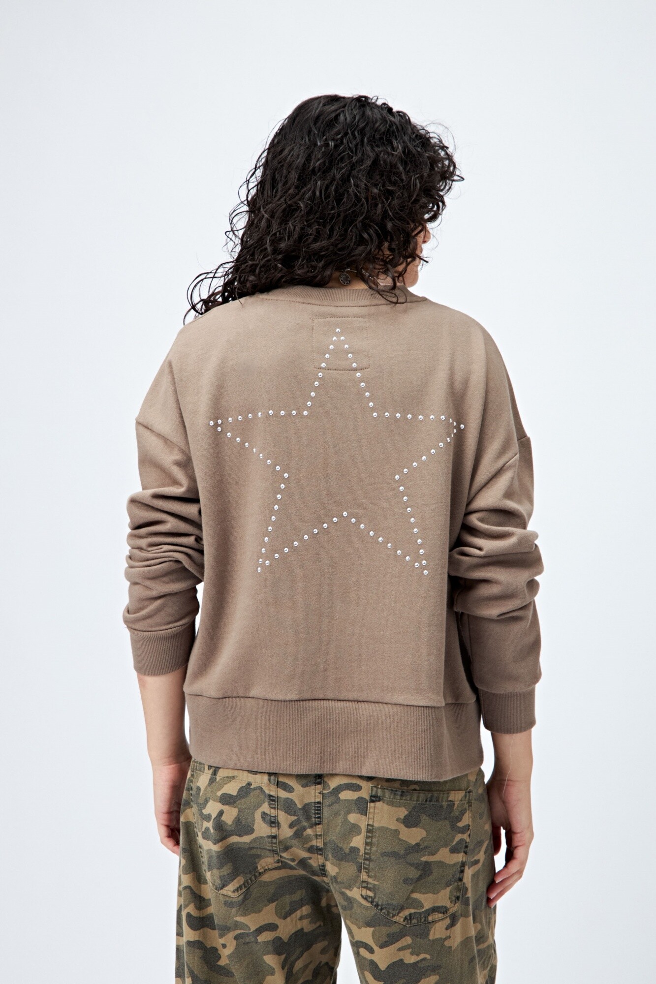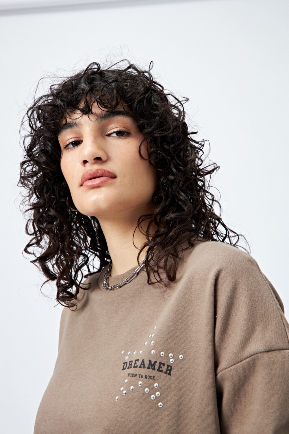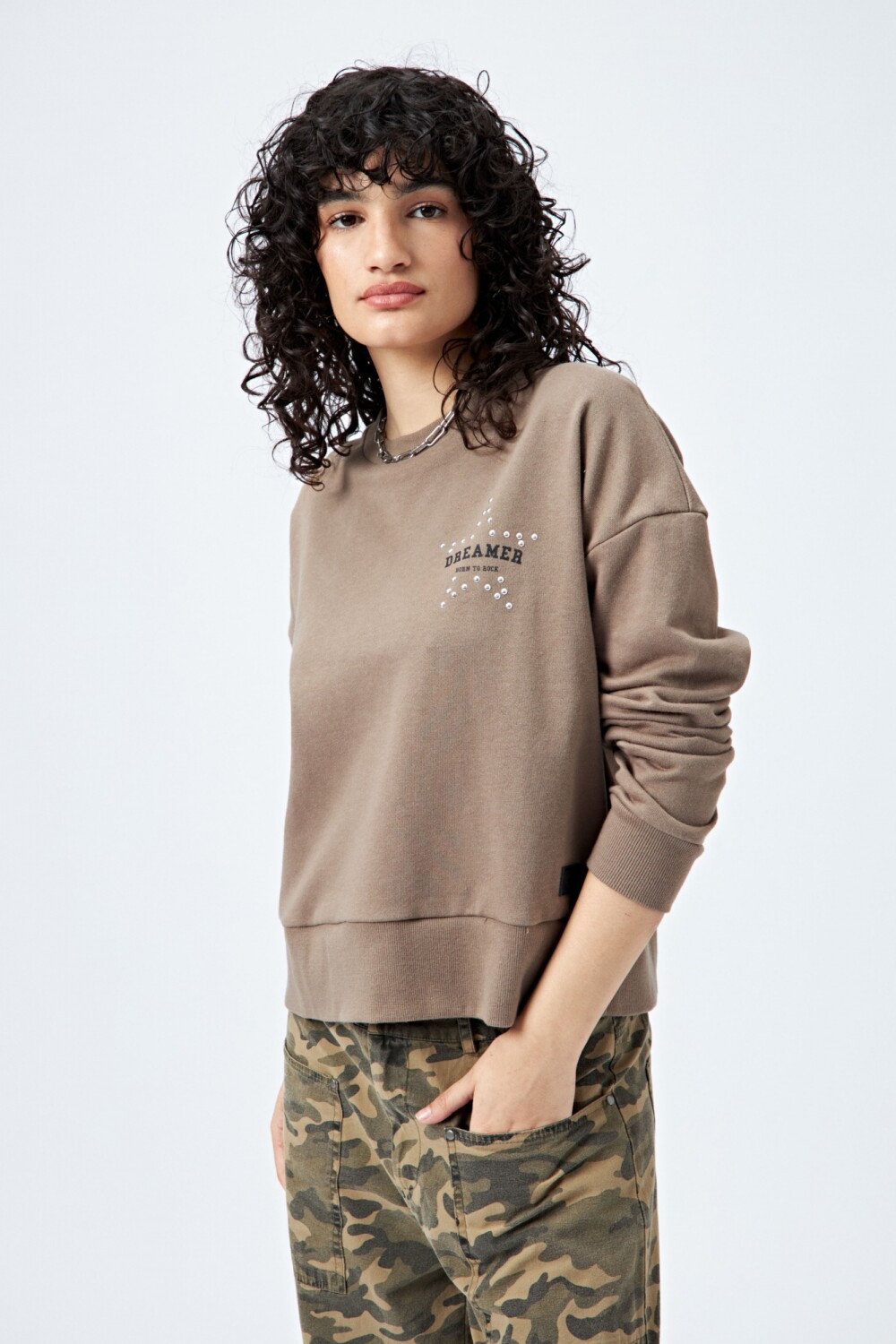 Buzo de fit relajado confeccionado en tejido de algodón con interior suave al tacto. Presenta detalle de estrella con tachas en la espalda y bordado delantero con la frase Dreamer – Born to rock, que le da un toque canchero y distintivo.