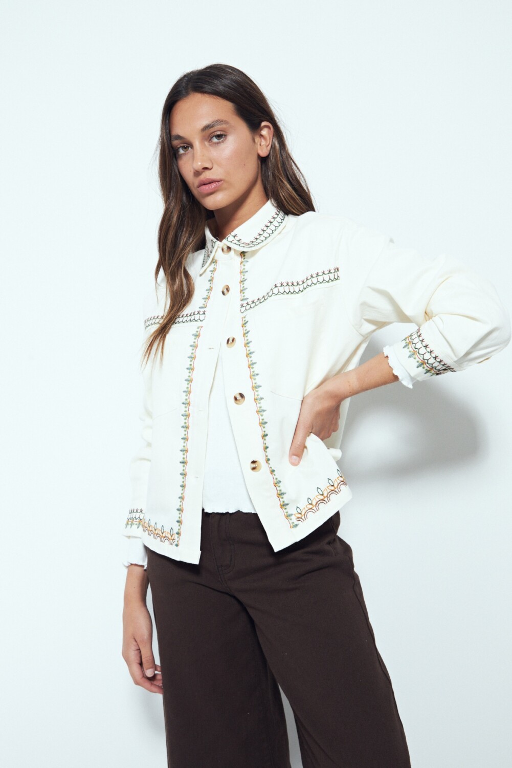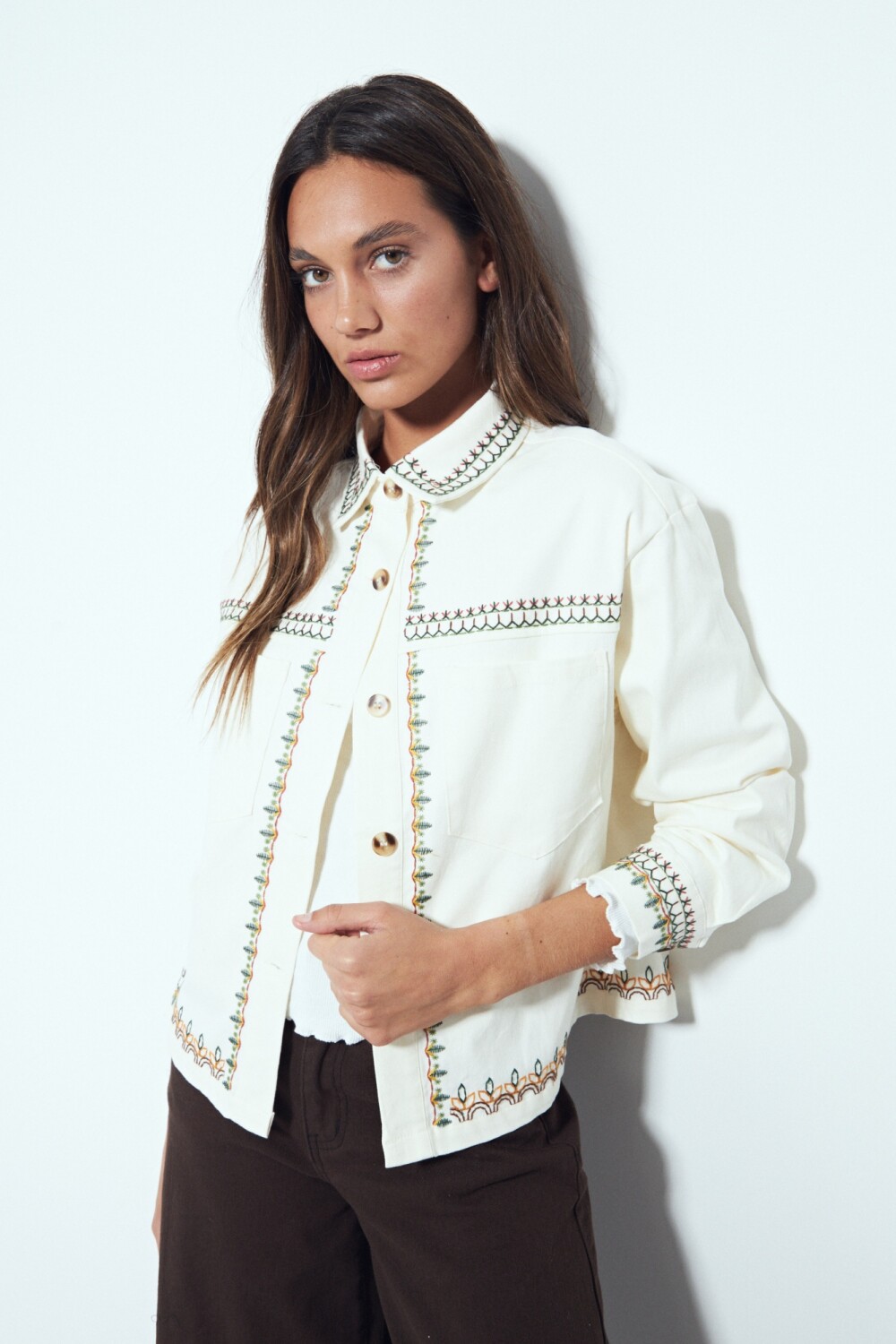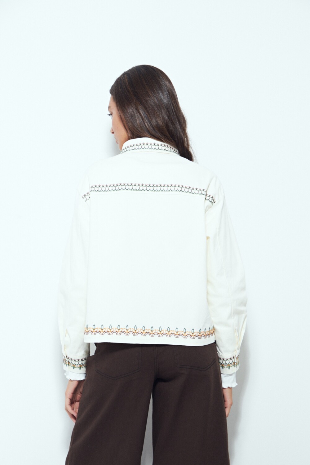Campera de jean bordada con inspiración artesanal, una prenda que fusiona el espíritu clásico del denim con detalles que marcan diferencia. Su diseño incorpora bordados geométricos en cuello, delantero con botones, bolsillos, puños y ruedo, aportando un guiño folk sutil que la convierte en protagonista del look.