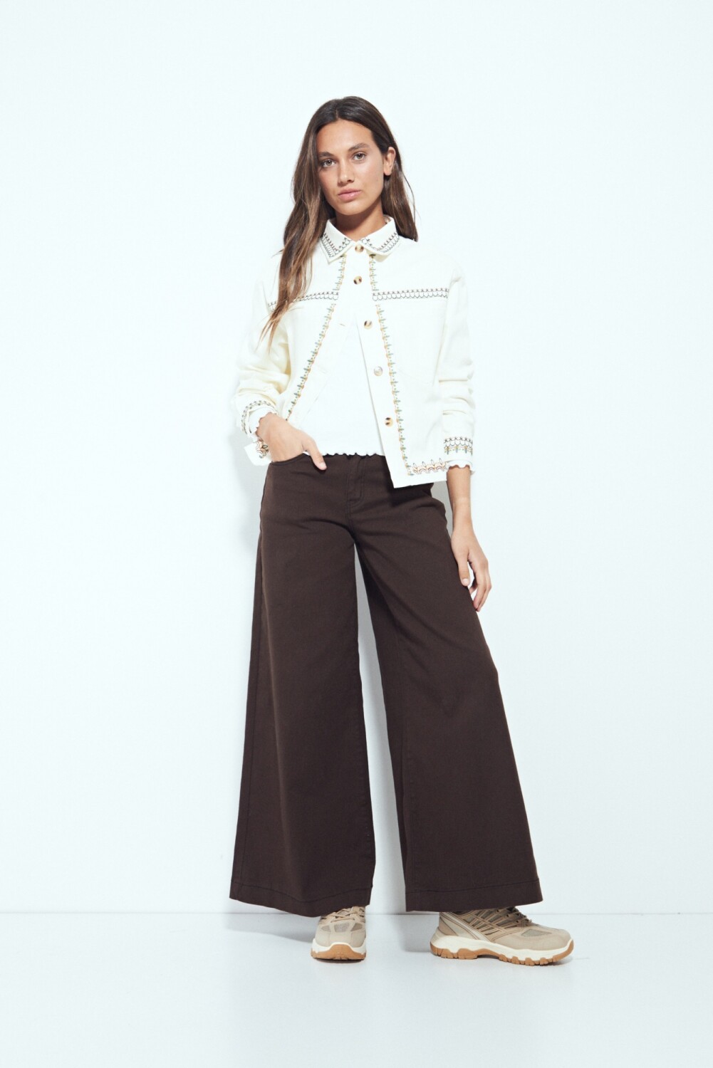 Confeccionada en denim con elastano, ofrece estructura y comodidad en el movimiento. El calce recto y levemente relajado permite llevarla tanto cerrada como sobrepuesta, ideal para sumar textura y personalidad a estilismos urbanos o combinaciones más boho.
