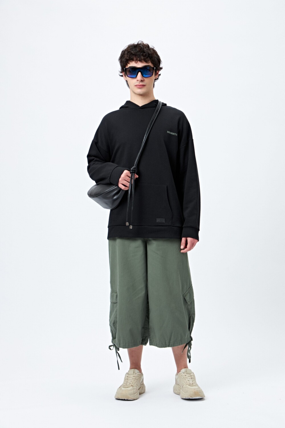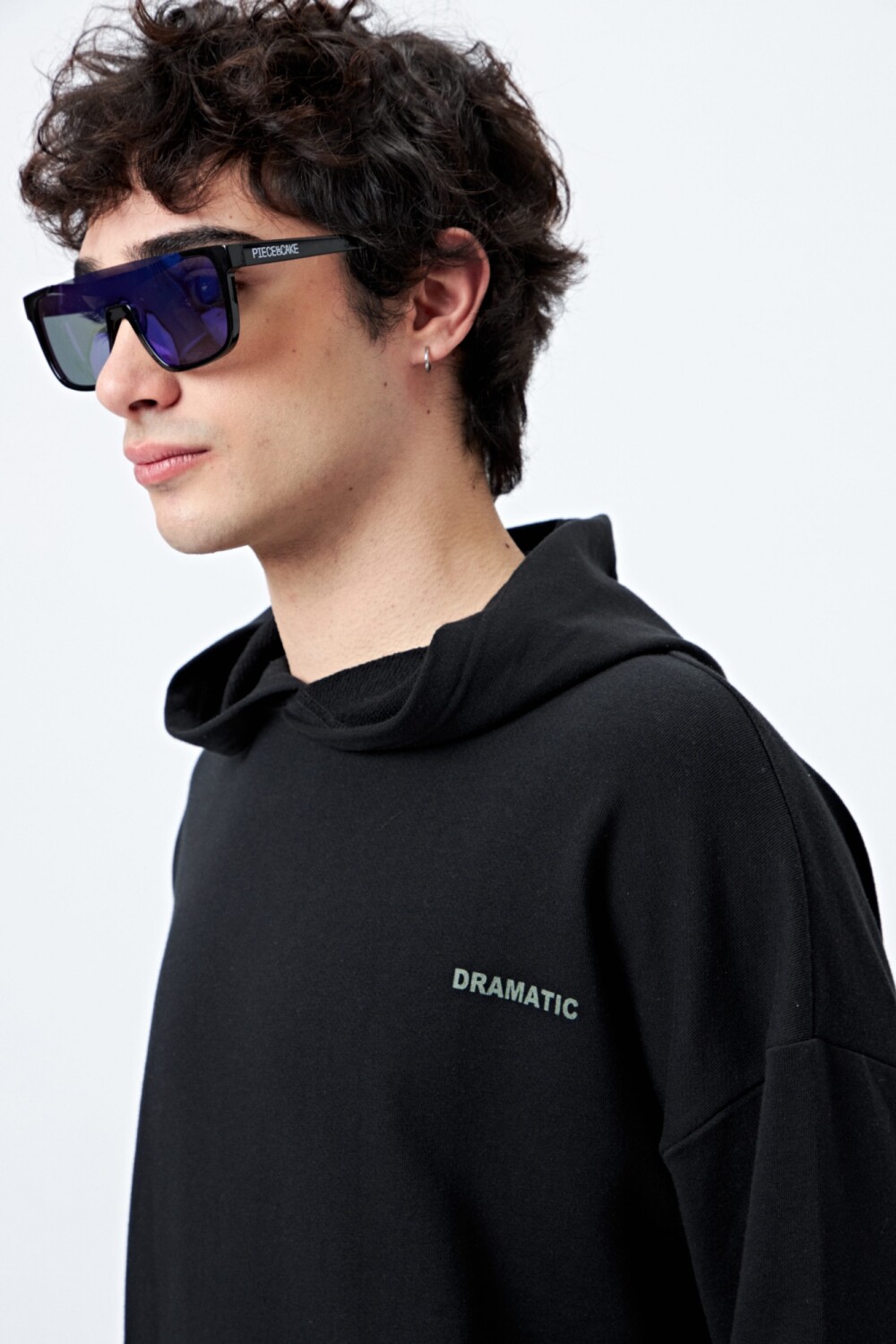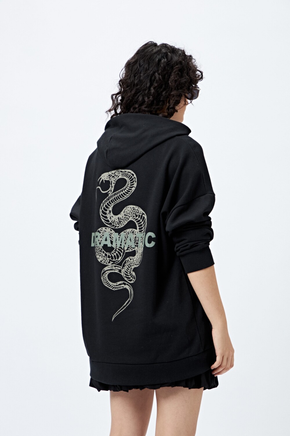 Un statement de estilo con impronta streetwear. Confeccionado en algodón con poliéster, este canguro de fit relajado incorpora capucha, bolsillo frontal y puños ajustados que suman confort. La estampa frontal con la palabra Dramatic aporta minimalismo, mientras que el gráfico en la espalda con tipografía bold y serpiente ilustrada le dan un aire fuerte y llamativo. Perfecto para looks urbanos con carácter, combinando con joggers, cargo o denim.