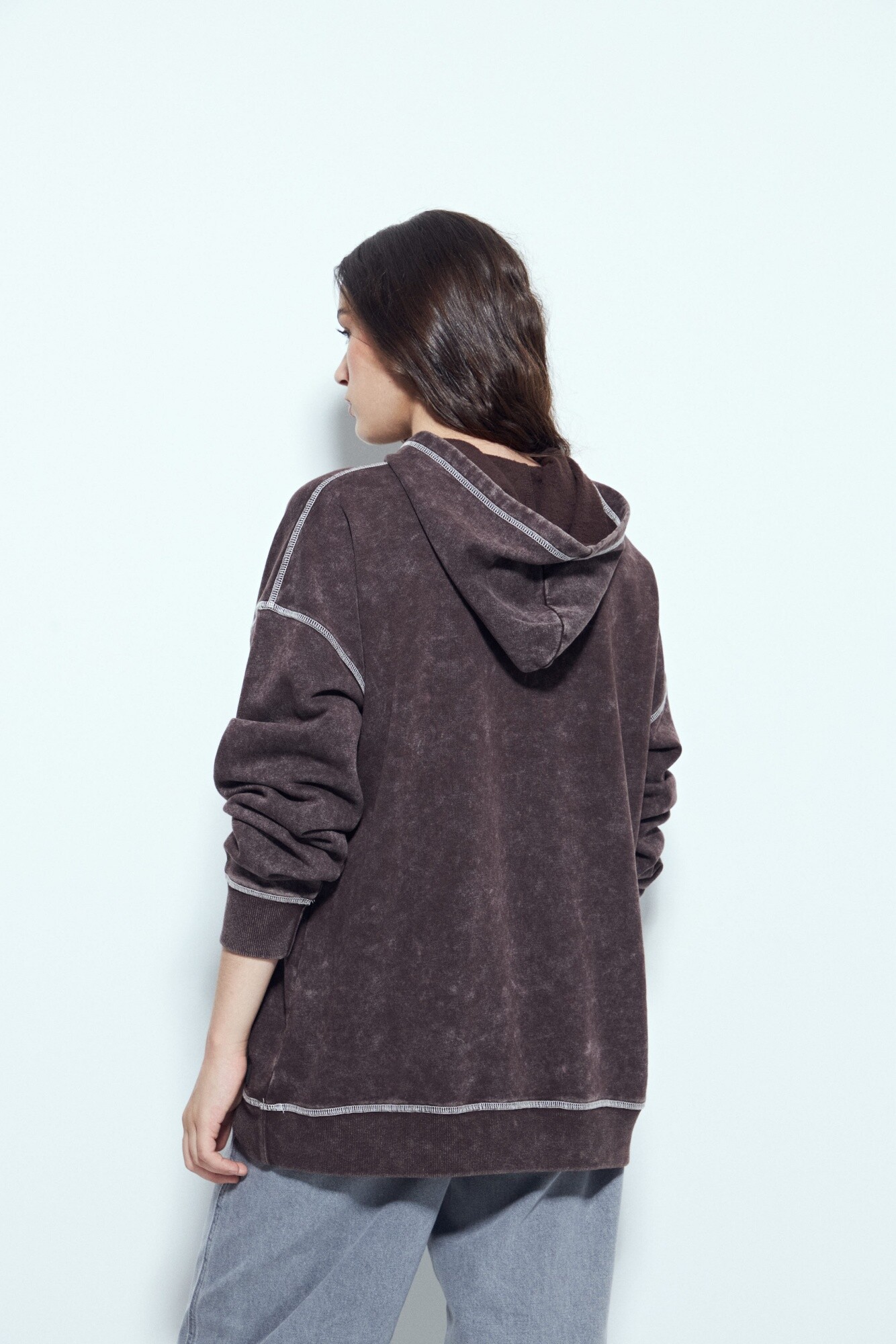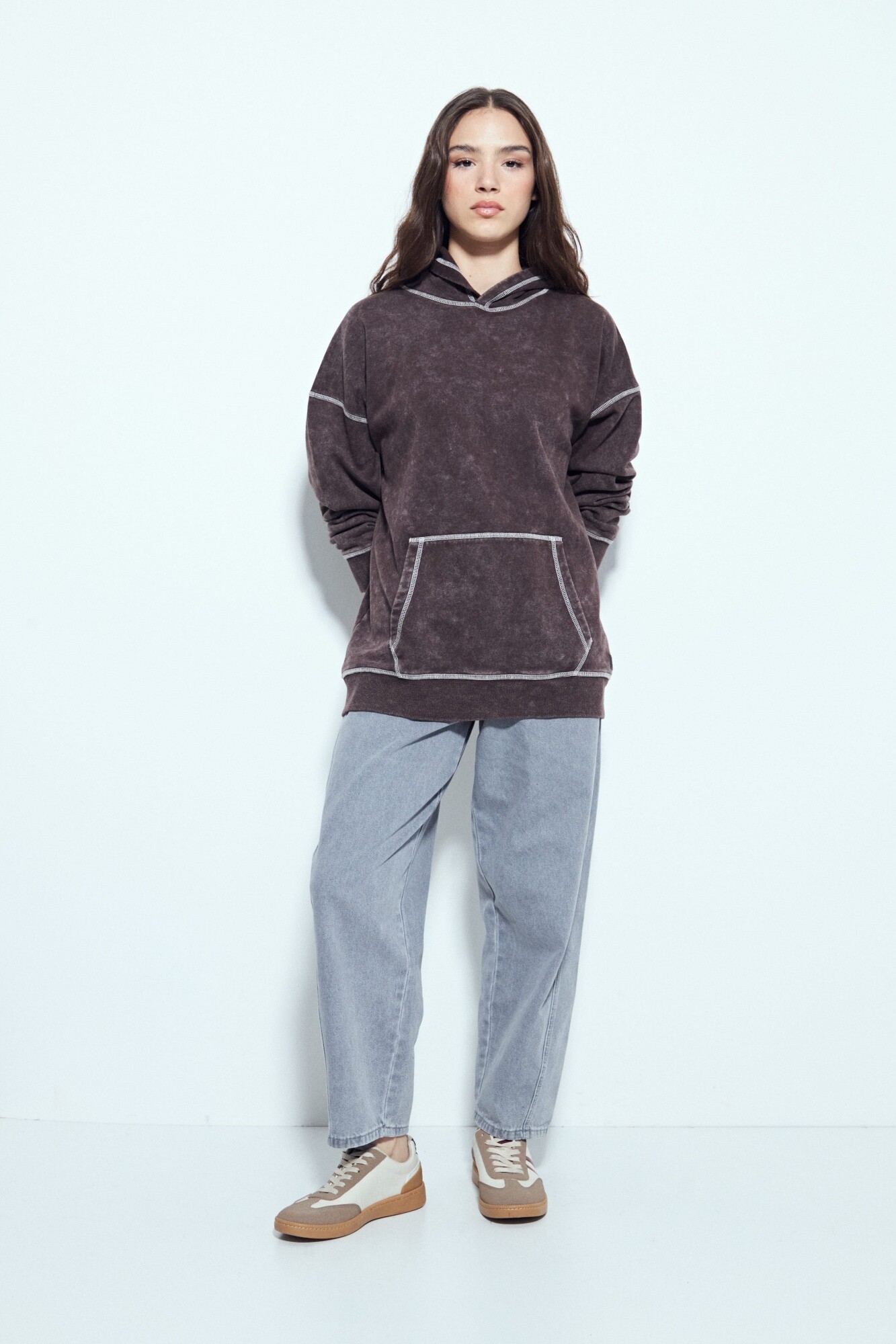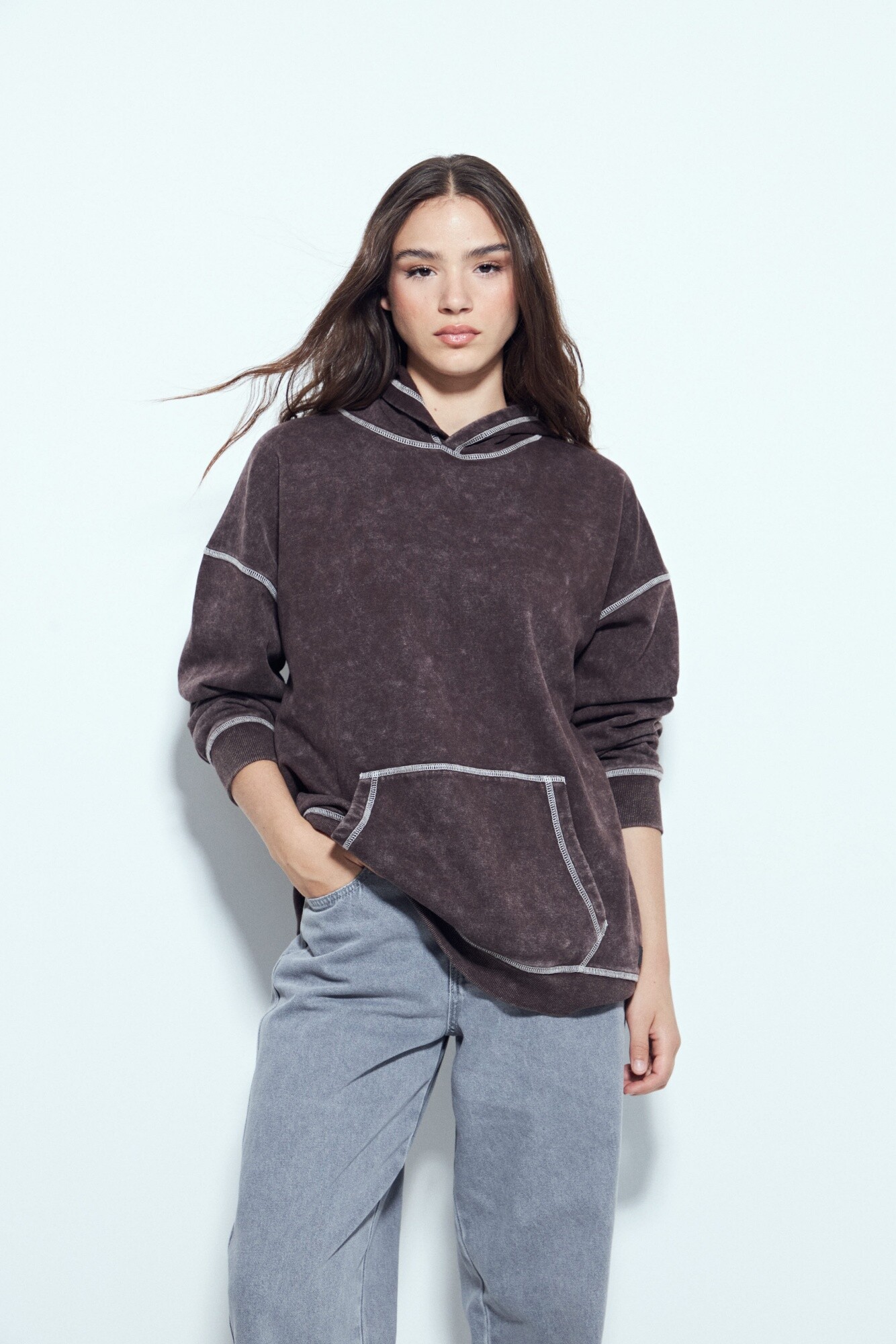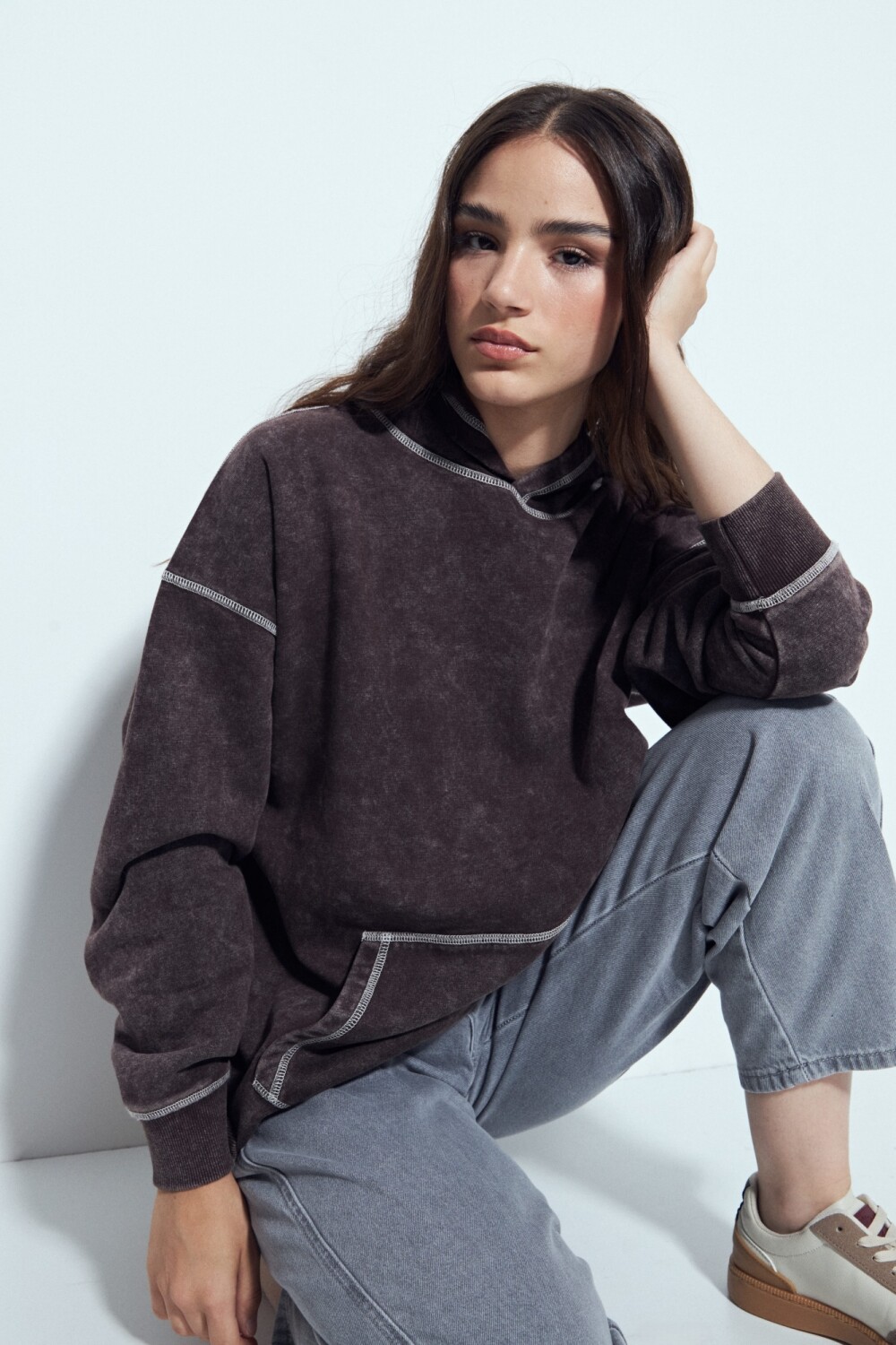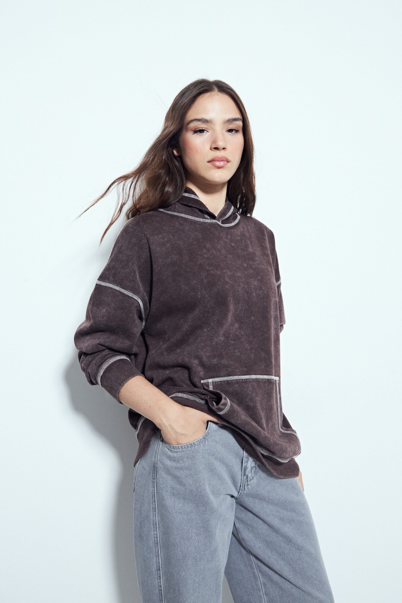 Buzo de calce relajado con estética urbana y un marcado efecto lavado que le aporta un look desgastado y actual. El diseño se destaca por las costuras a la vista en contraste, que suman carácter y un guiño utilitario, además del bolsillo frontal tipo canguro que refuerza su impronta casual. La capucha integrada completa una silueta cómoda y versátil, ideal para looks diarios con actitud. Una prenda clave para elevar cualquier look con un aire moderno y descontracturado.