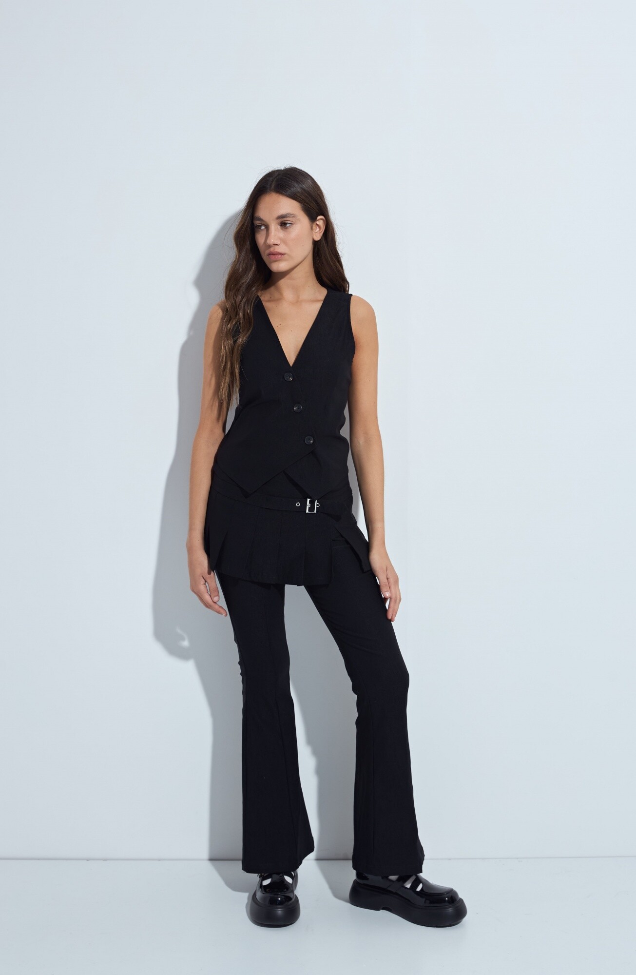 Chaleco sastrero de escote en V, una prenda que reinterpreta el estilo de sastrería con un enfoque moderno y versátil. Su diseño entallado con botones al frente estiliza la silueta y lo convierte en una opción ideal para looks de oficina o para elevar un outfit más relajado con un toque sofisticado.