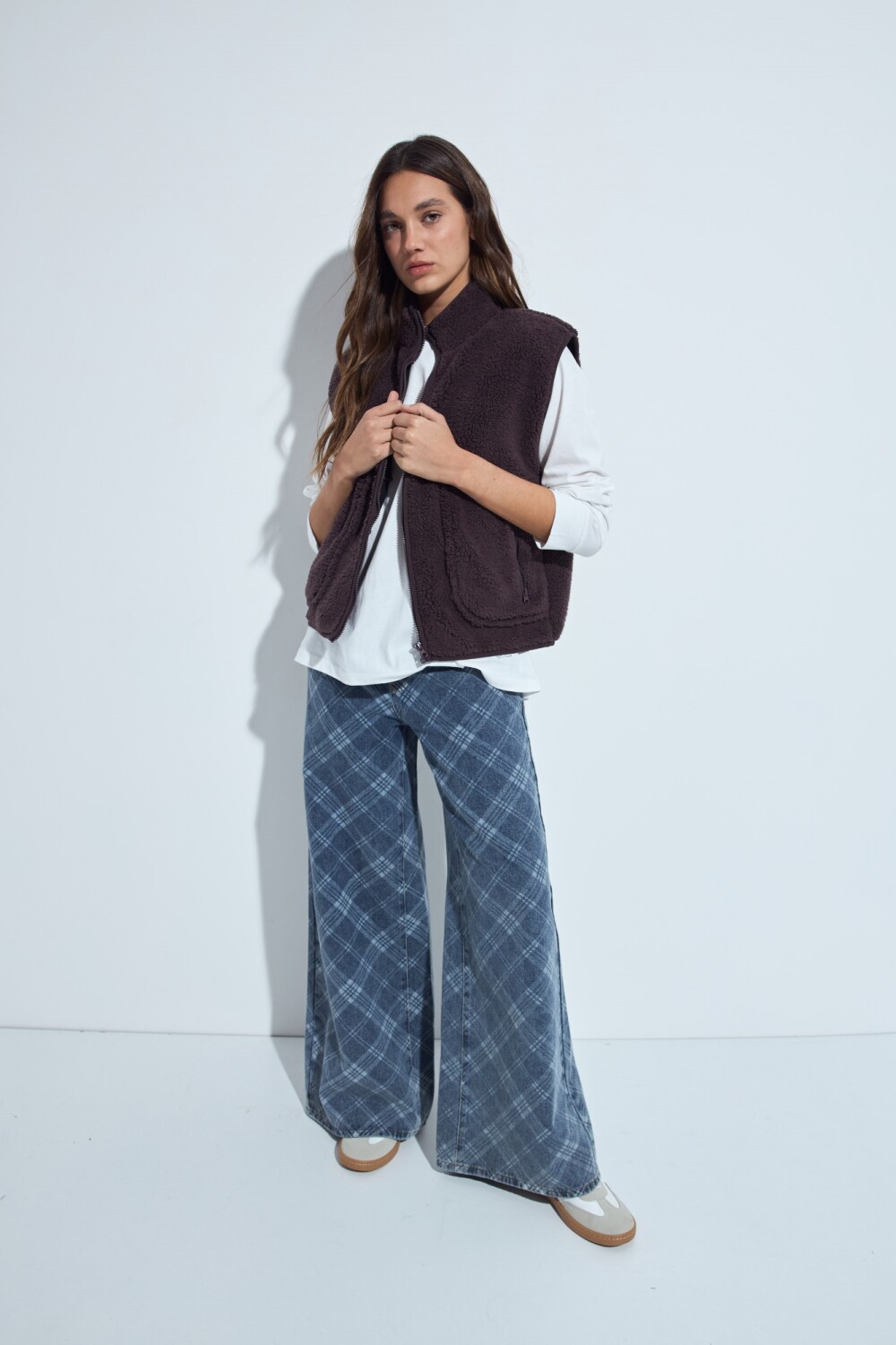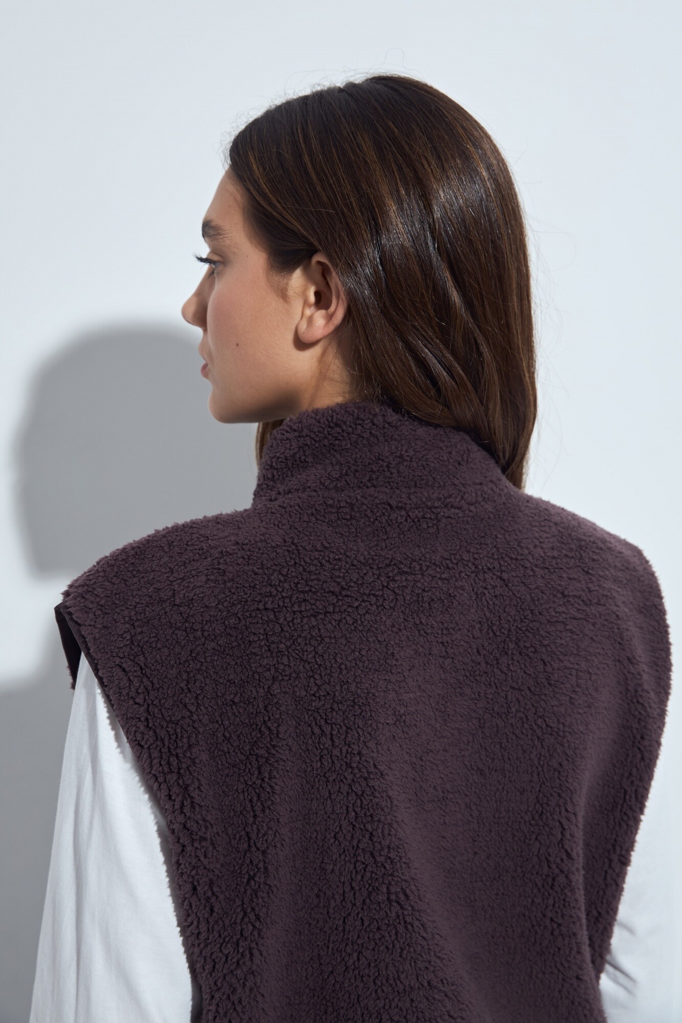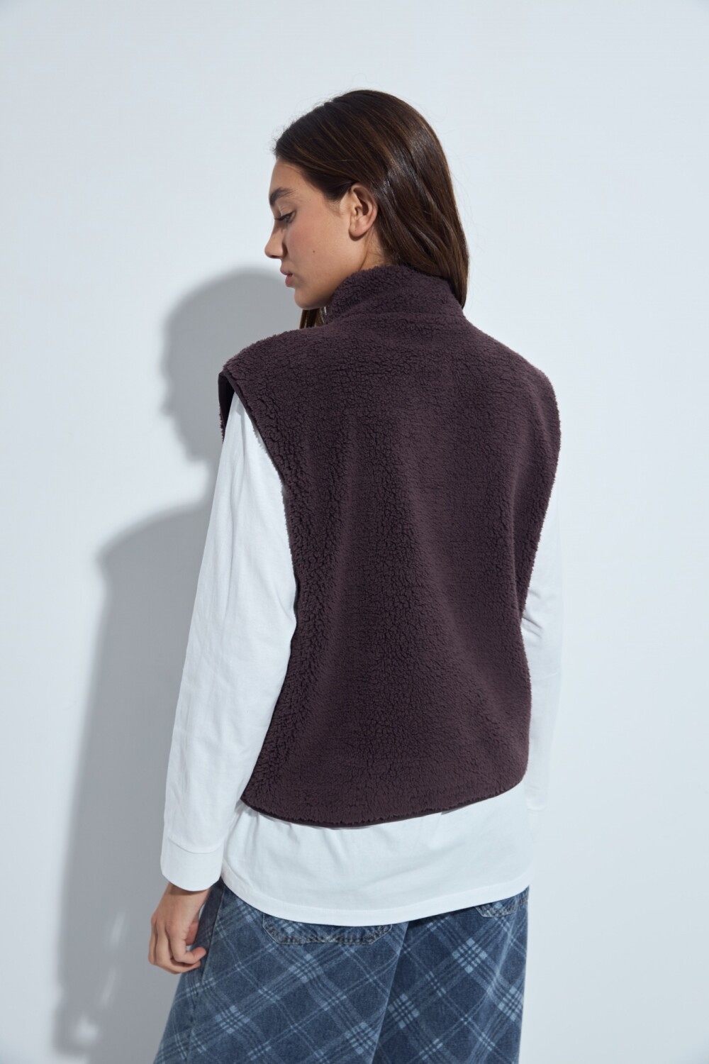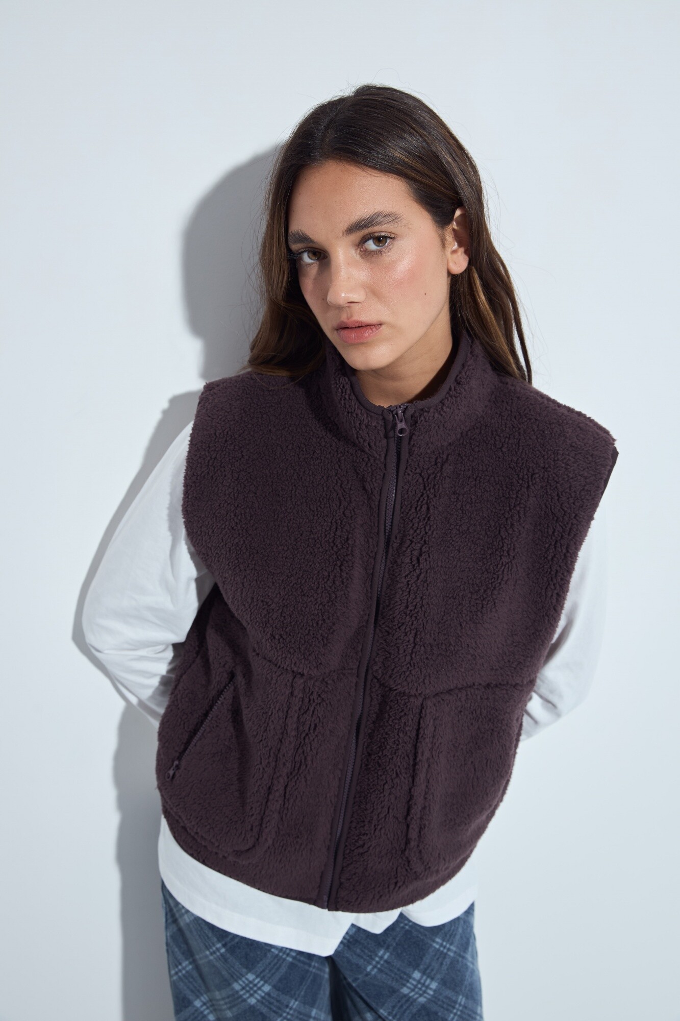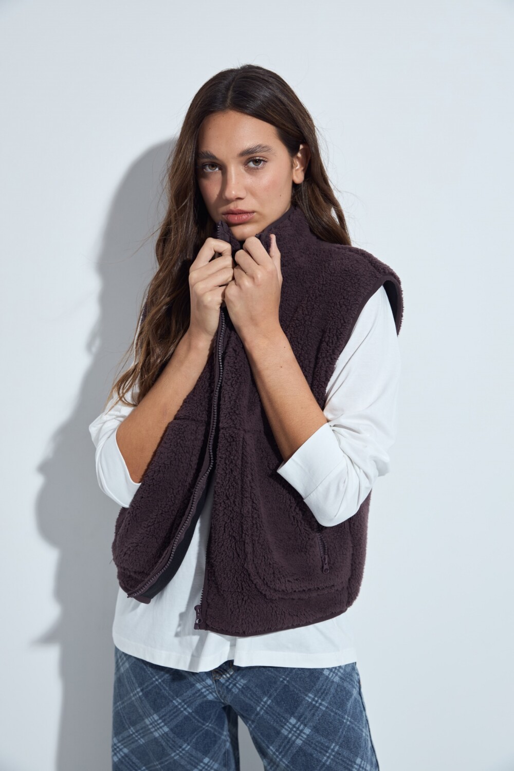 Chaleco de corderito con textura soft, ideal para sumar abrigo sin perder liviandad. Su diseño con cierre frontal y bolsillos amplios aporta funcionalidad, mientras que el calce relajado lo convierte en una prenda versátil para superponer sobre sweaters o remeras. Un básico invernal que combina confort y estilo en capas.