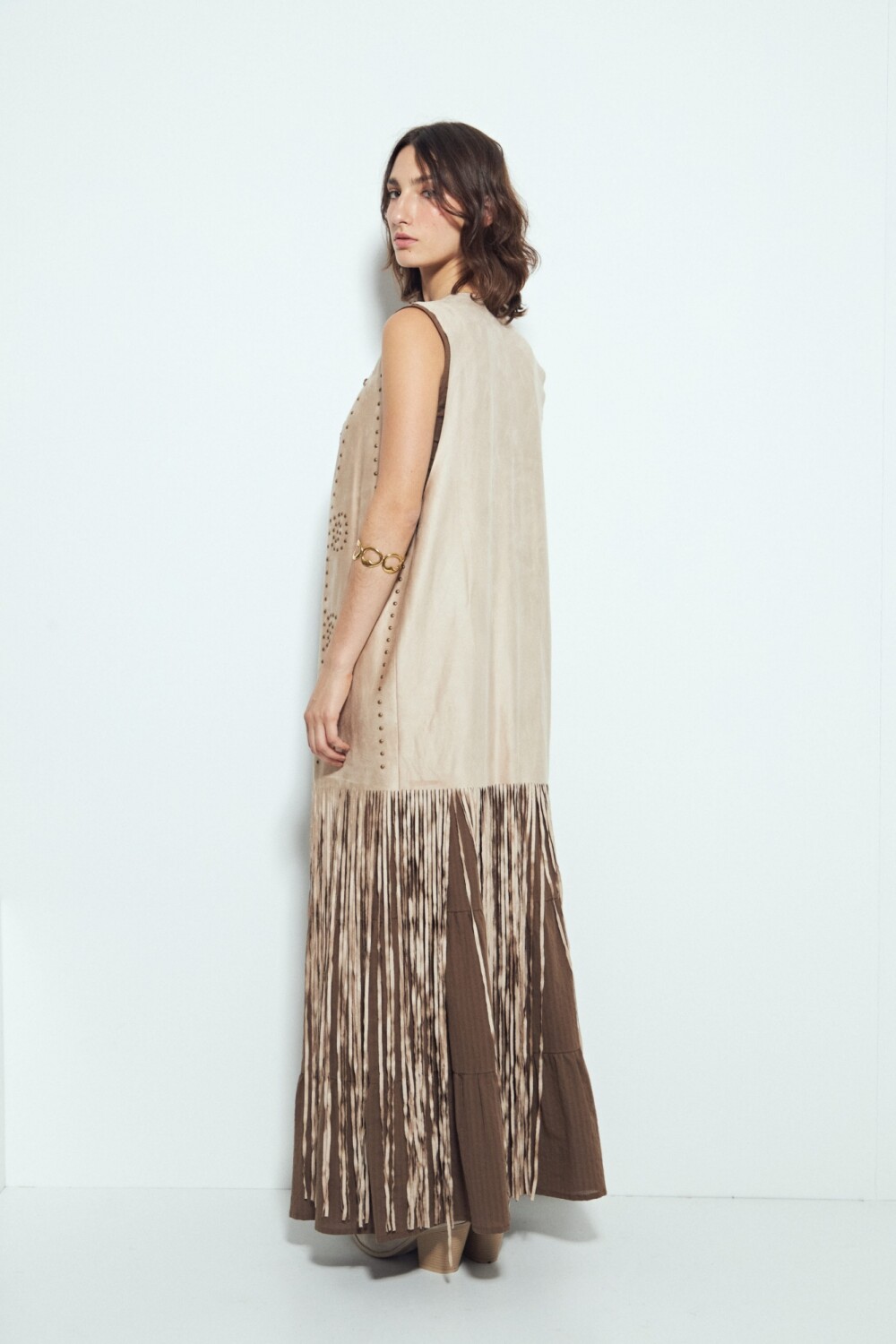 Chaleco largo con flecos y apliques metálicos.