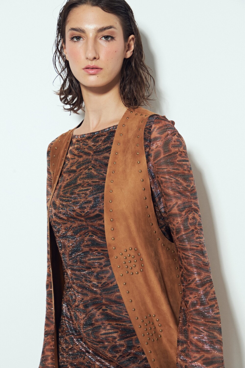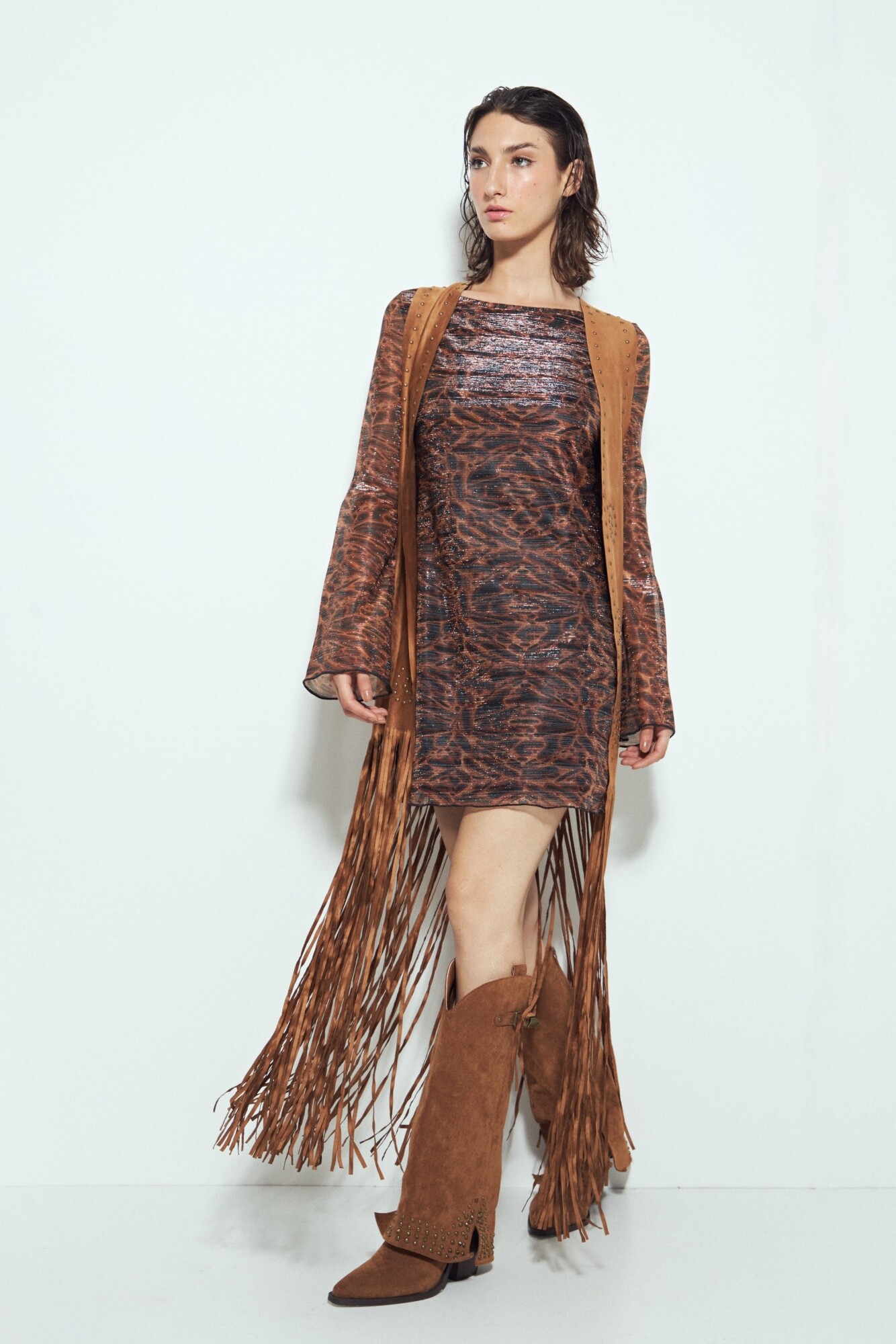 Diseño de impronta boho con caída fluida y movimiento marcado por el flecado en el ruedo, un detalle que aporta dinamismo y carácter al look. Presenta apliques metálicos distribuidos en el frente que suman textura y un acento urbano, equilibrando el espíritu artesanal del diseño. Su calce relajado lo convierte en una pieza versátil, ideal para superponer y transformar estilismos tanto de día como de noche. Clave para elevar cualquier look con un guiño trendy y actual.