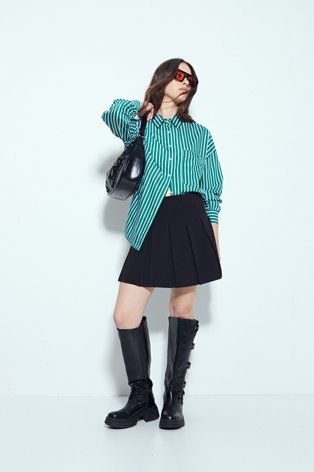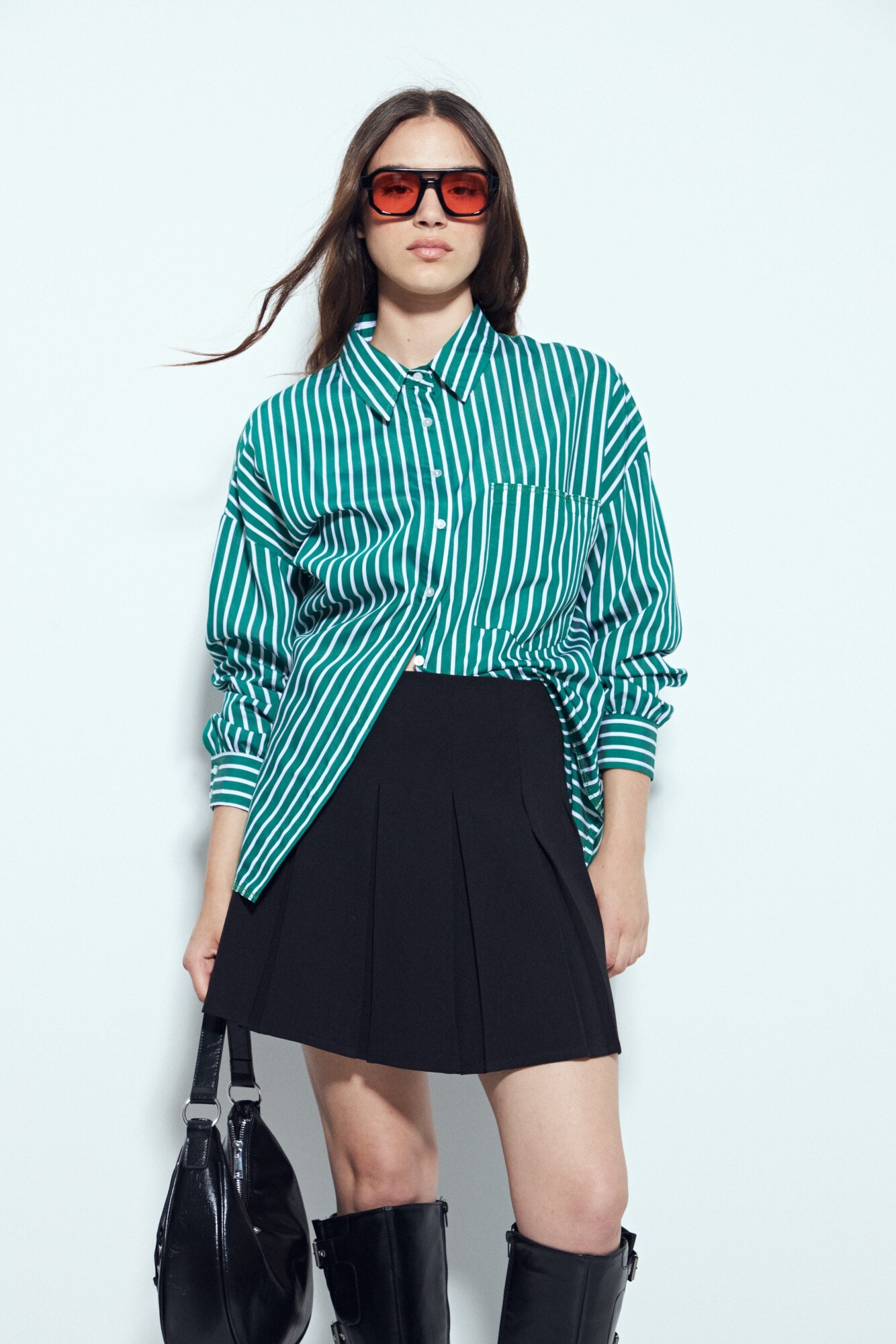 Minifalda tableada de estética moderna que combina estructura y fluidez en una misma pieza. Sus tablas aportan movimiento y volumen, generando una silueta dinámica que se adapta con facilidad a distintos estilos. De calce cómodo gracias al leve porcentaje de elastano, es una opción versátil para armar looks urbanos con un toque en tendencia.