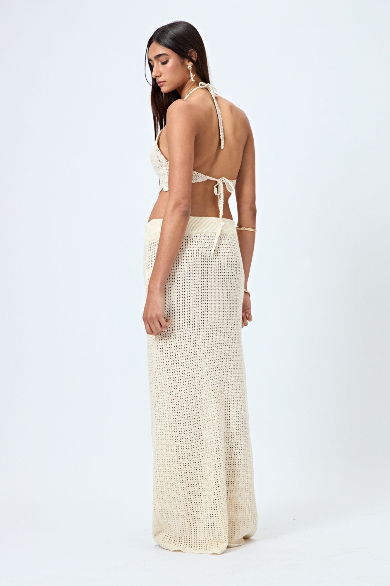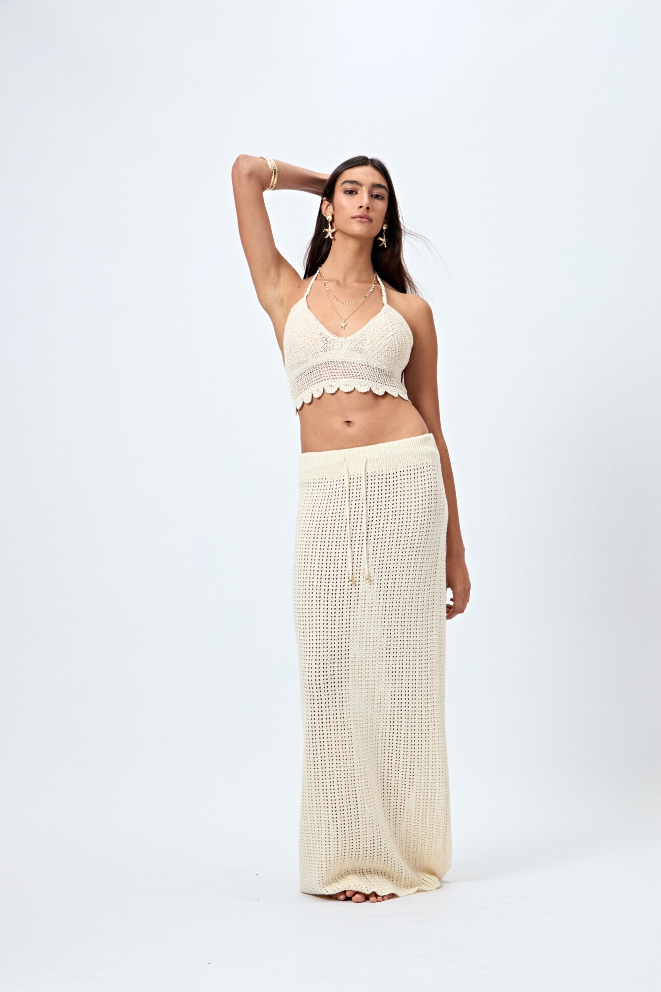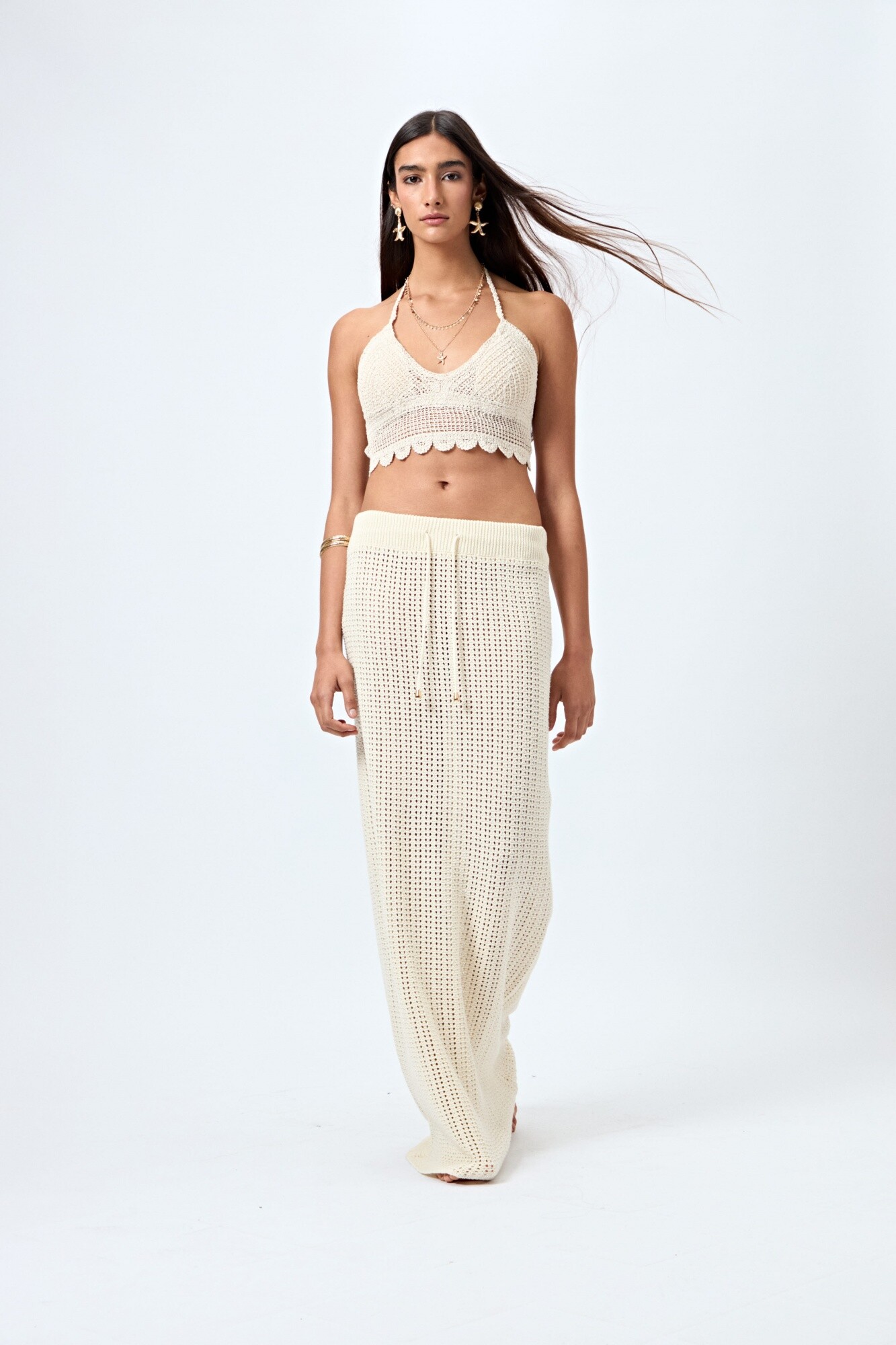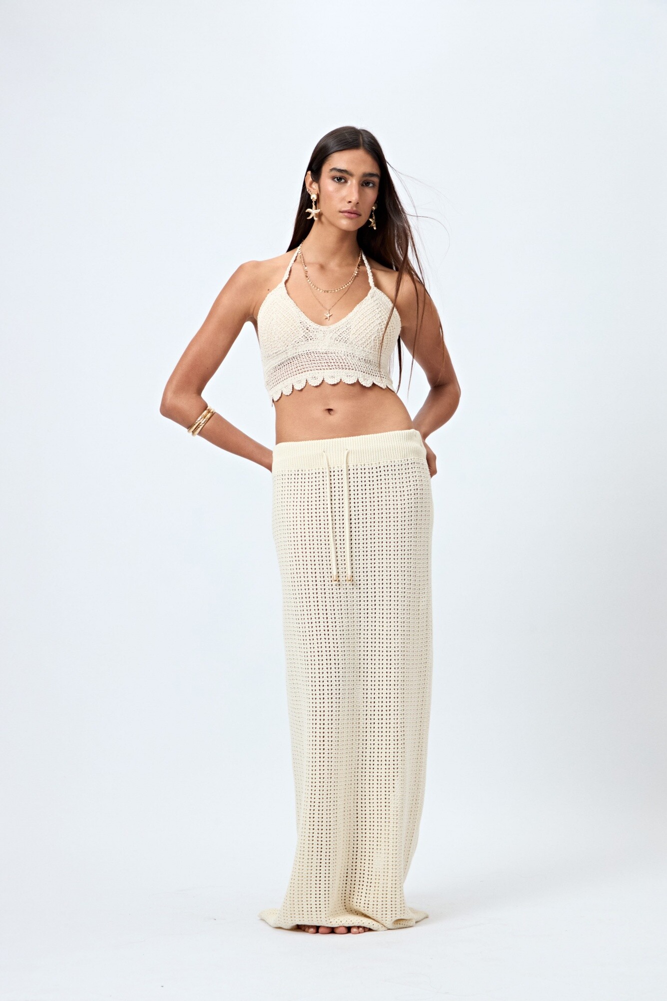 Falda larga tejida con trama calada y cordón ajustable en la cintura. Su confección en algodón le aporta una caída liviana y natural, ideal para acompañar looks de playa o de tarde con tops tejidos o bikinis. Una prenda clave del verano que combina textura artesanal y estilo relajado.