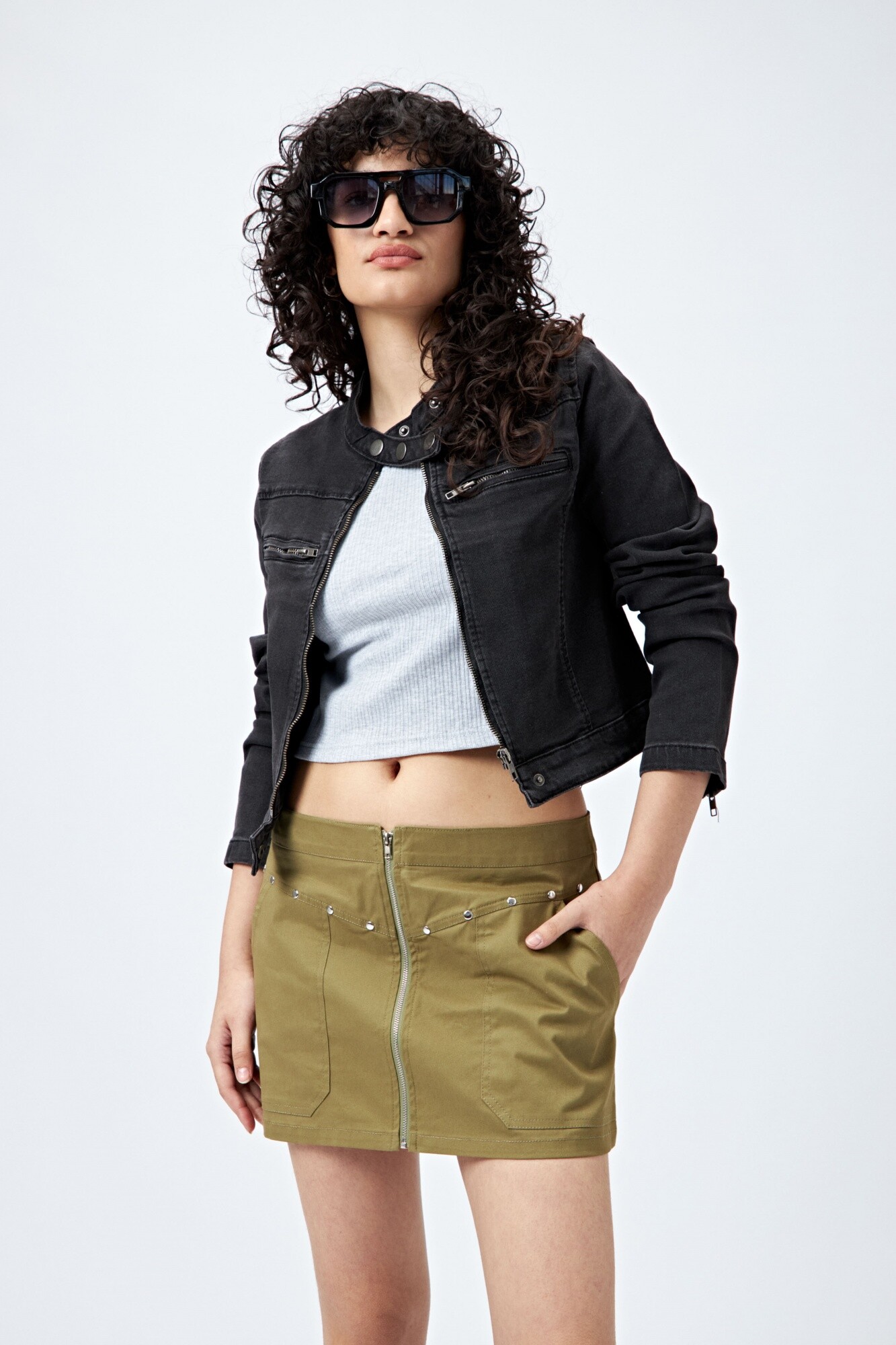 Minifalda de corte recto con cierre metálico visible al frente y bolsillos decorativos con tachas. Su diseño estructurado aporta un aire moderno y canchero, perfecto para looks con botas o zapatillas. Ideal para quienes buscan una prenda versátil y con actitud, que se adapta tanto a un outfit de día como de noche.