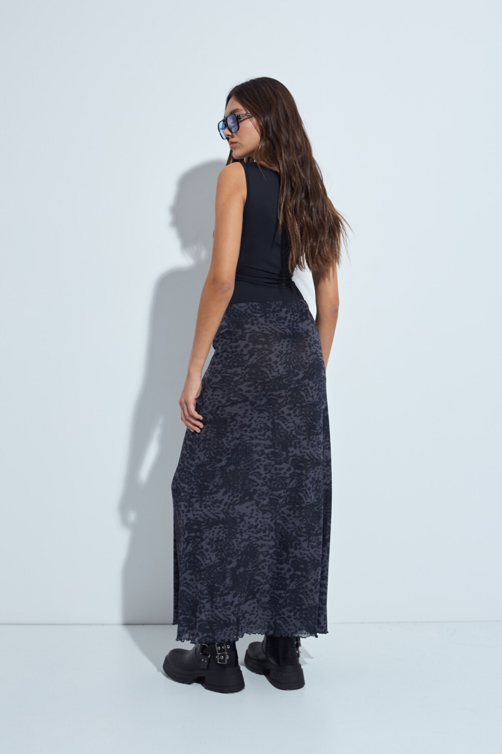 Falda larga estampada que se destaca por su silueta fluida y su diseño en tendencia. El calce suave acompaña el movimiento y la convierte en una opción versátil para looks de día o de noche, ideal para combinar con prendas ajustadas o capas superiores. Una pieza actual que suma estilo sin perder comodidad.