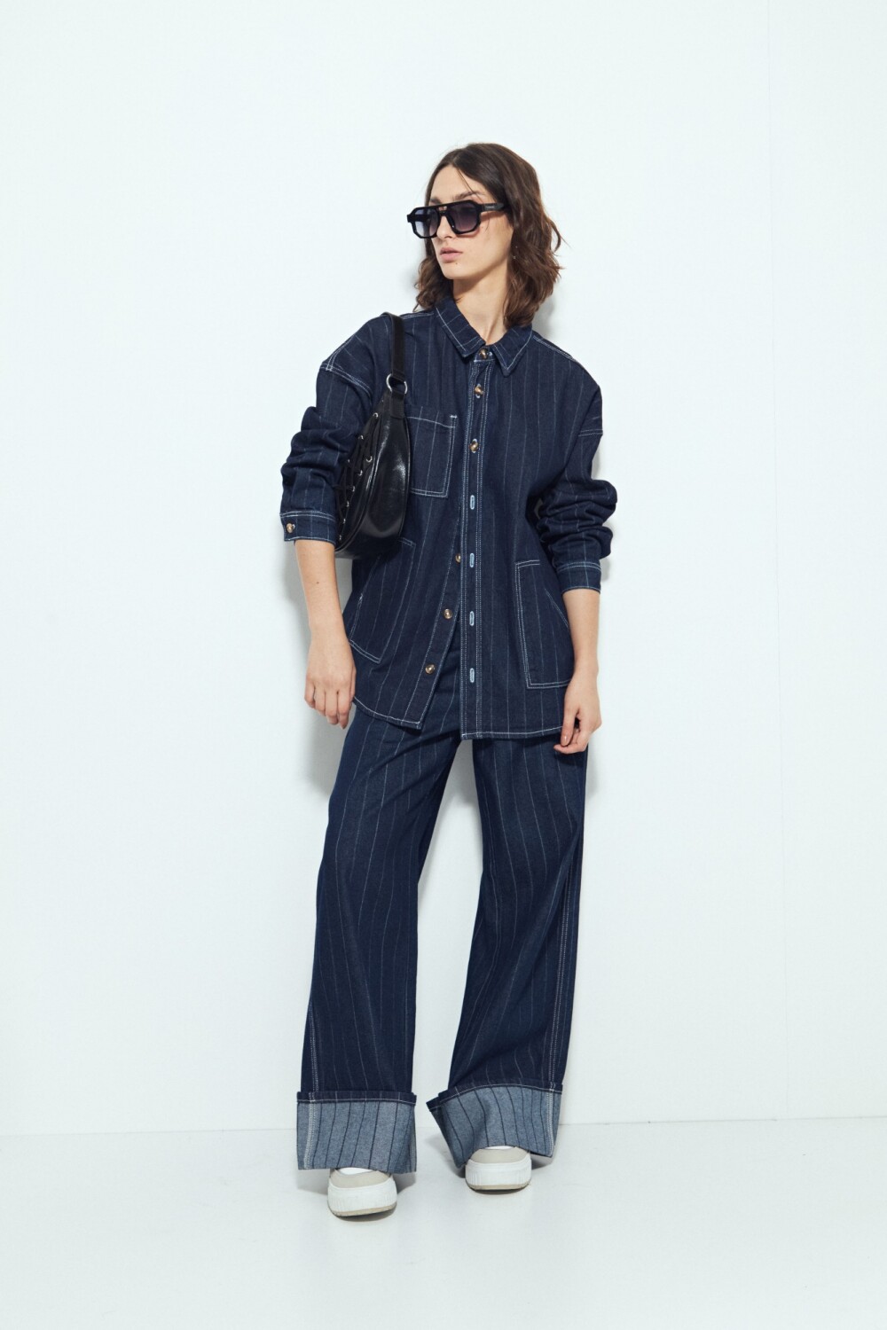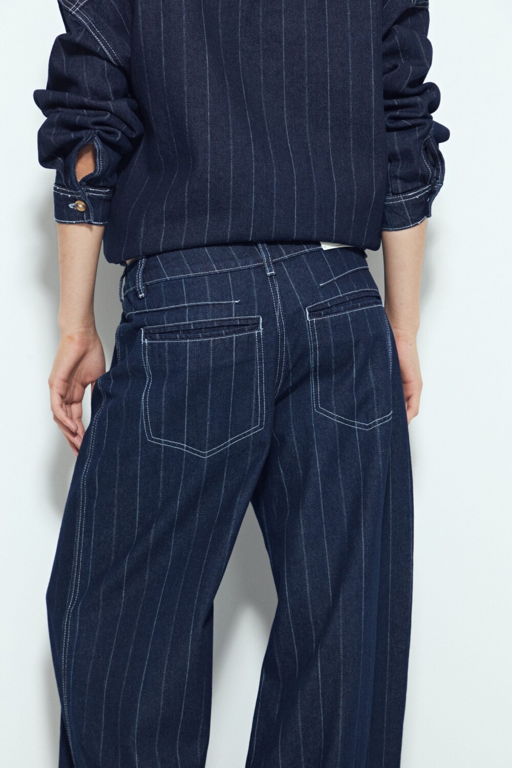 Jean de denim a rayas de tiro bajo, con una silueta amplia que aporta un aire moderno y relajado al look. El diseño se destaca por las costuras visibles y el dobladillo ancho, un detalle que suma personalidad y refuerza su impronta urbana. Confeccionado en denim de algodón con mezcla de poliéster, ofrece estructura, comodidad y un calce favorecedor para el uso diario.