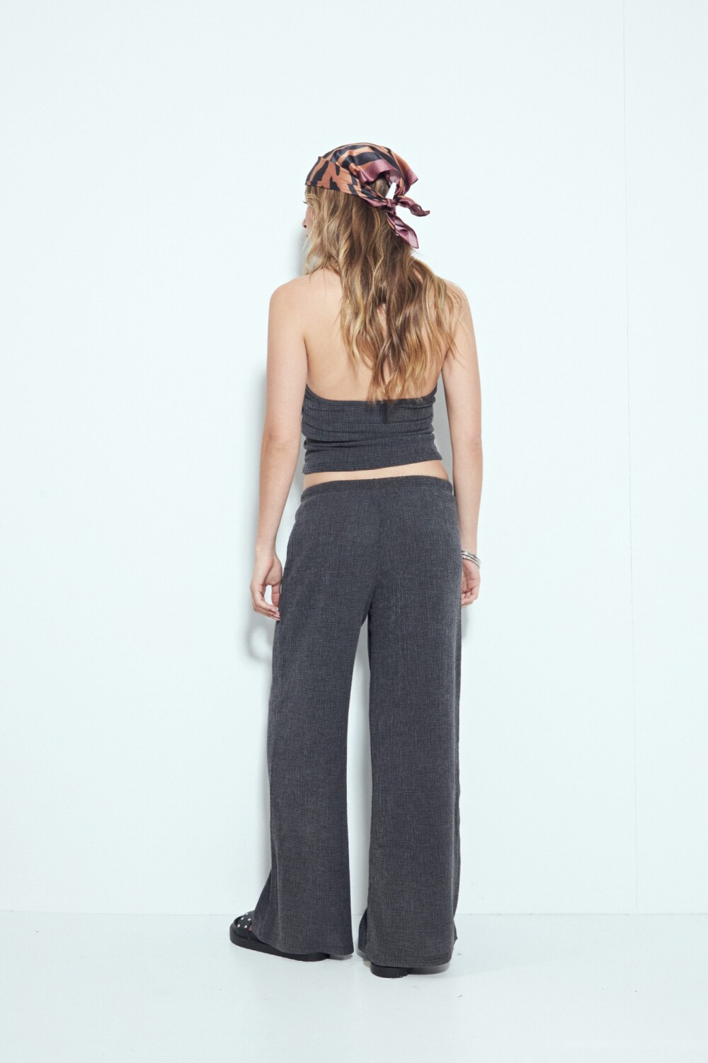Pantalón de tiro bajo de calce relajado, diseñado para aportar comodidad y un look descontracturado con actitud. Presenta cintura con ajuste mediante lazo que permite regular el calce, mientras que la pierna amplia acompaña el movimiento y refuerza su impronta fluida.
