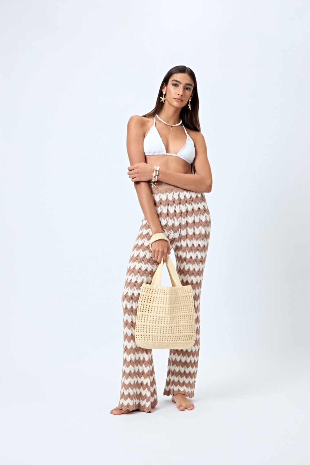 Pantalón tejido con motivo zigzag y silueta flare. Su textura artesanal y cintura elastizada lo convierten en una pieza clave para looks relajados de verano. Perfecto para usar sobre bikinis o combinar con tops de punto, aportando un aire boho chic al look.