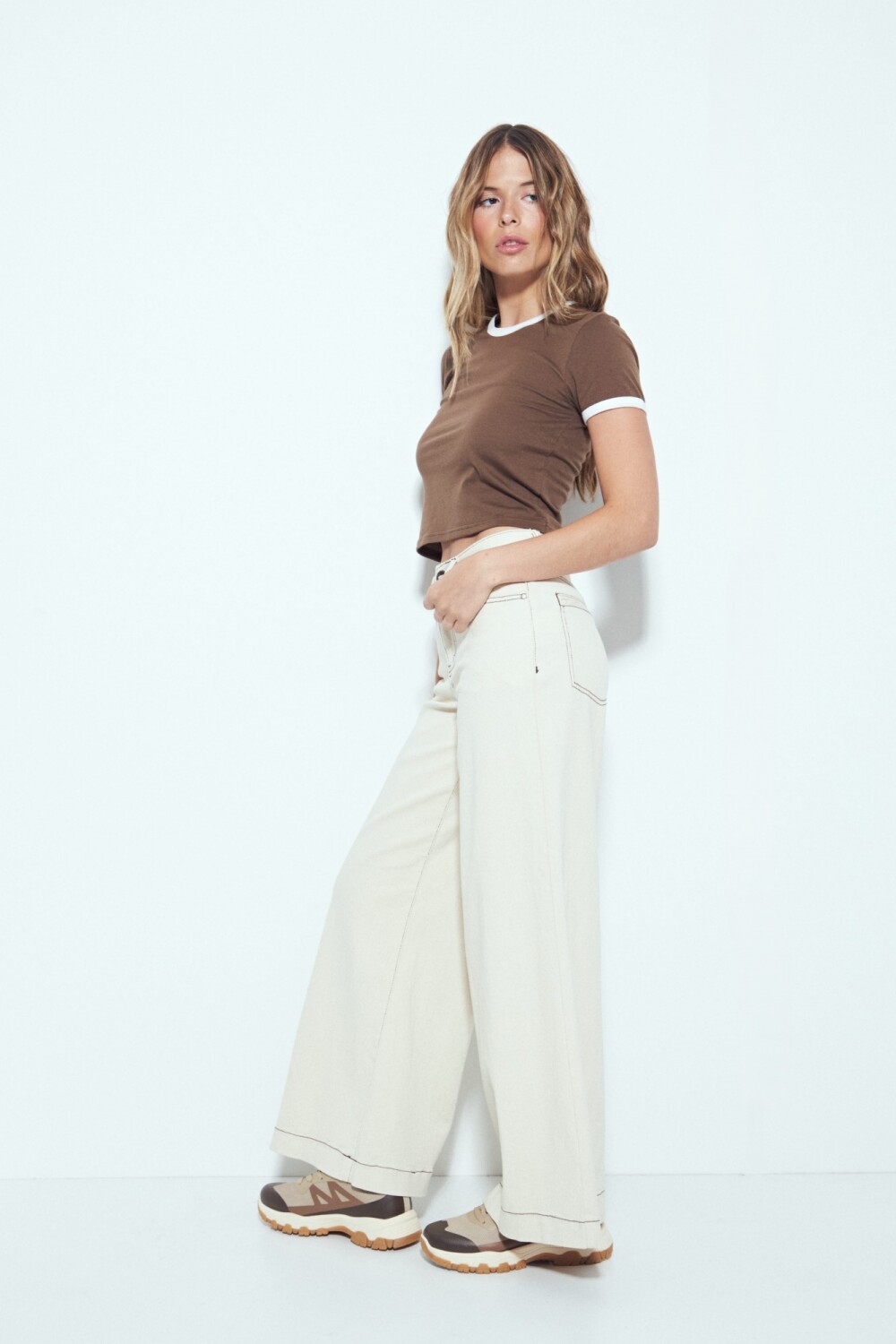 Pantalón de pierna amplia con silueta relajada y calce cómodo, diseñado para aportar presencia y movimiento en cada paso. Su confección en denim con leve elasticidad ofrece estructura sin perder confort, ideal para looks urbanos y actuales. Un básico versátil que funciona tanto en combinaciones casuales como en propuestas más elevadas, clave para elevar cualquier look.