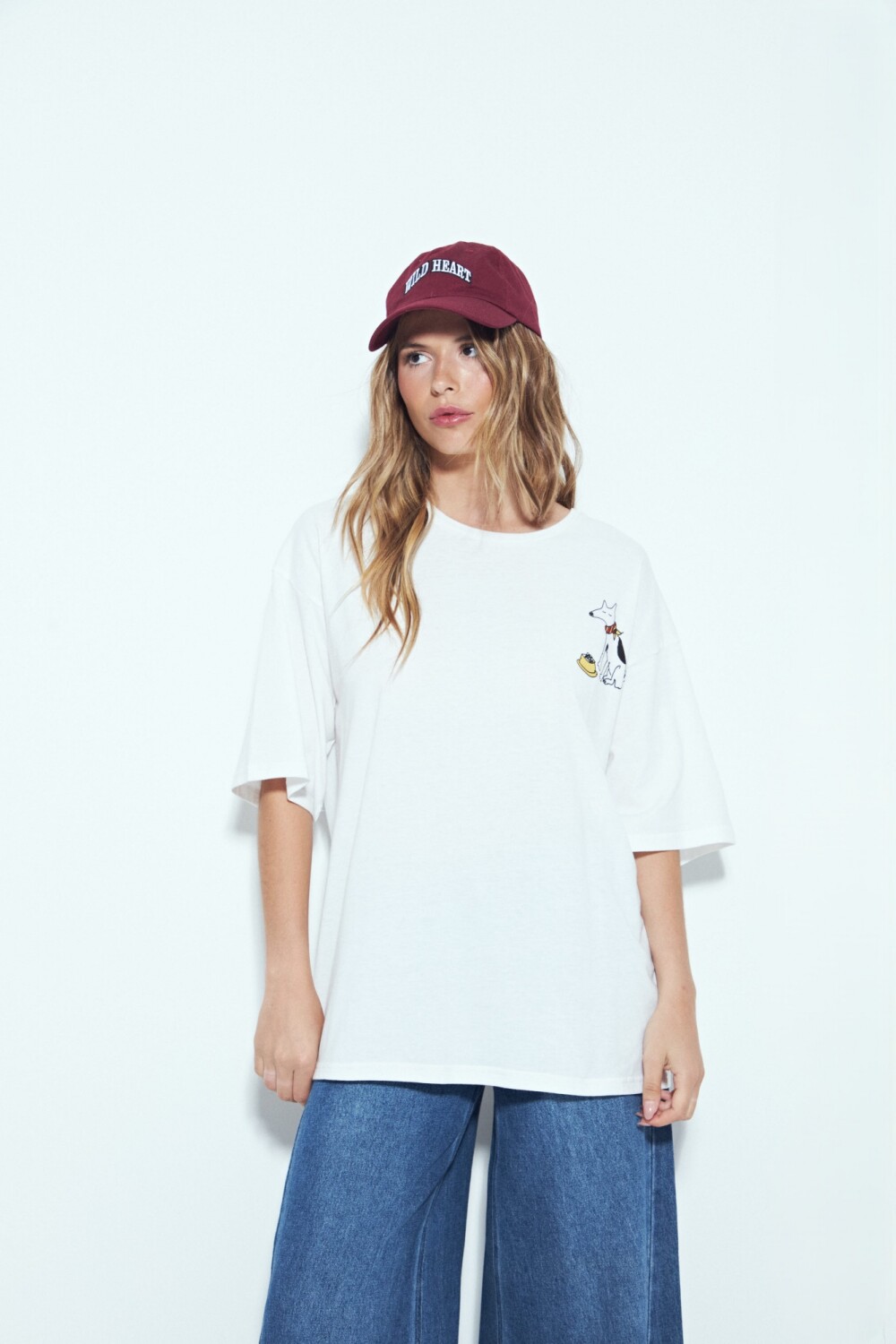 Remera de manga corta de calce relajado, con cuello a la base y silueta amplia que aporta un look descontracturado y actual. El diseño combina un estampado frontal pequeño con una estampa protagonista en la espalda, logrando un equilibrio entre detalle y statement gráfico. Una prenda cómoda, versátil y en tendencia, clave para elevar cualquier look urbano o casual.
