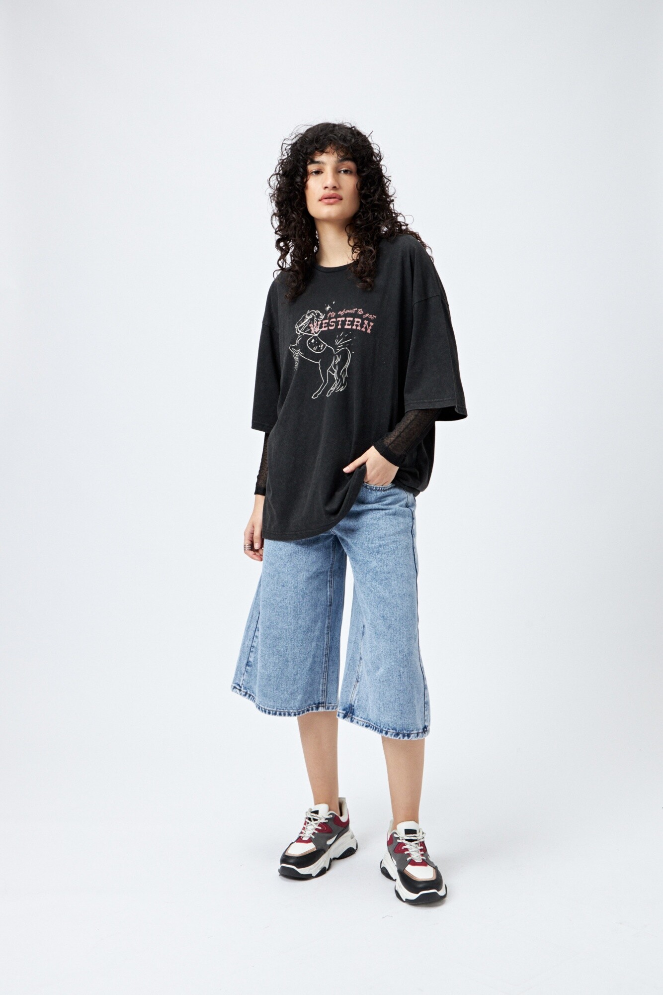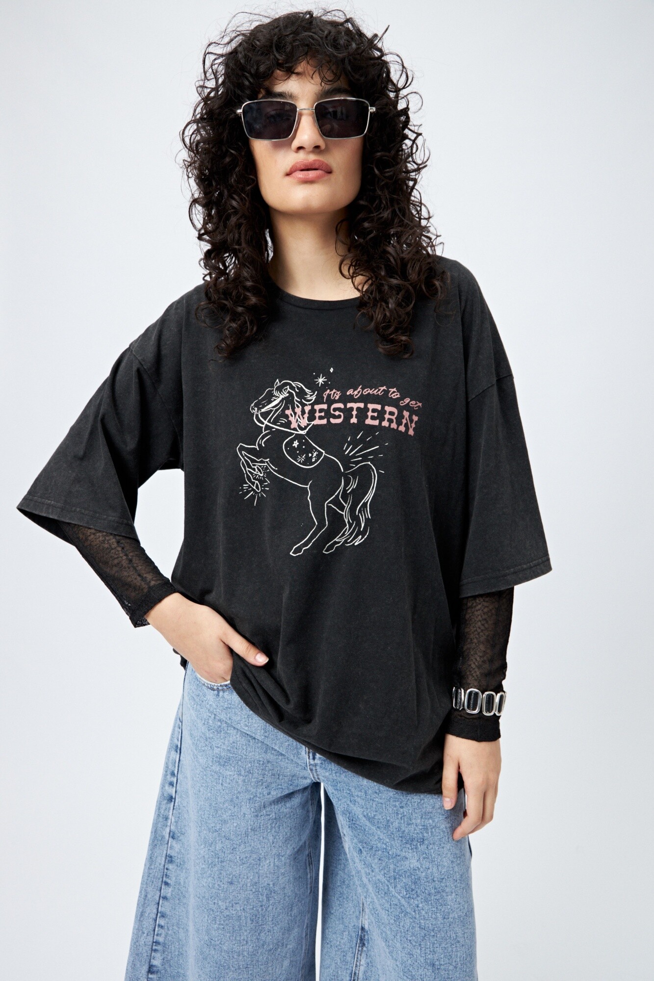 Remerón de manga corta confeccionado en tejido suave y liviano con efecto lavado. Su silueta amplia y relajada lo convierte en un must para un look con actitud. La estampa frontal con guiño western suma personalidad y tendencia, ideal para combinar con denim o pantalones anchos.