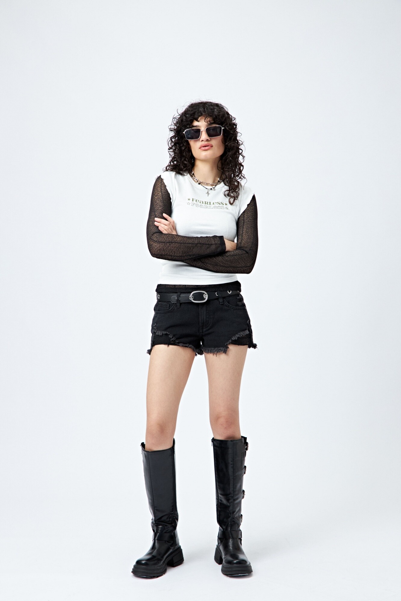 Confeccionada en un suave tejido de algodón, poliéster y elastano, esta remera combina comodidad y estilo con una silueta entallada y terminaciones con volados sutiles. La estampa frontal “Fearless” le aporta un toque audaz y trendy, ideal para sumar personalidad a cualquier look. Perfecta para usar sola o superpuesta con mangas de tul o camisas abiertas.