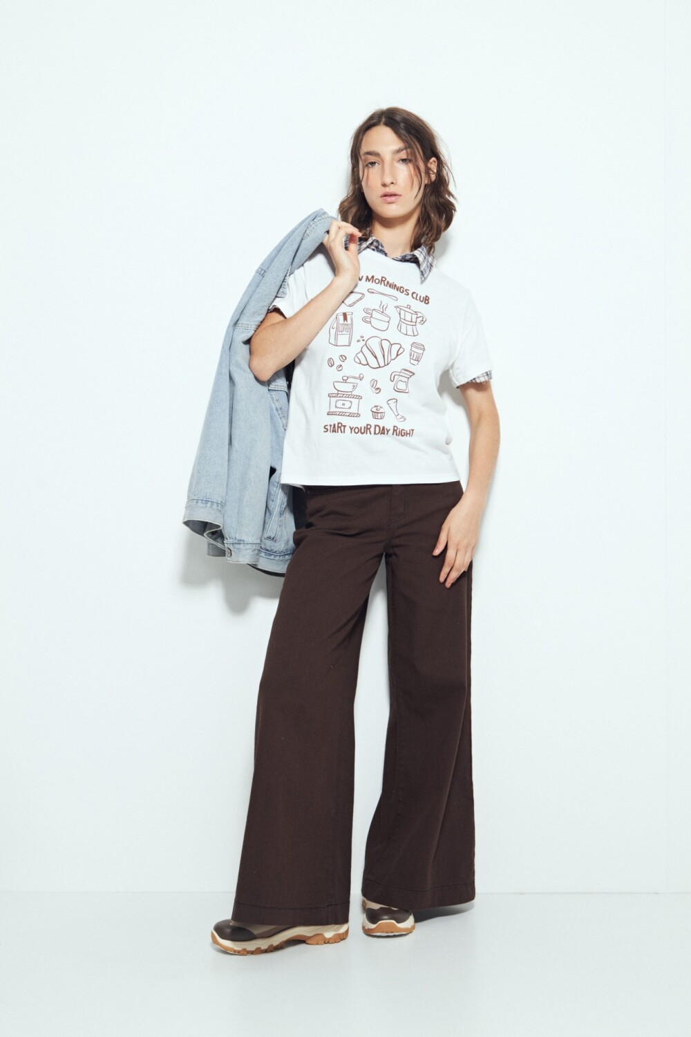 Remera estampada de manga corta con diseño gráfico al frente que aporta un guiño relajado y actual. El print suma personalidad y hace de esta prenda una opción ideal para looks urbanos y descontracturados, fácil de combinar y clave para elevar cualquier look. La camisa que se ve debajo forma parte del estilismo y no está incluida en la prenda.