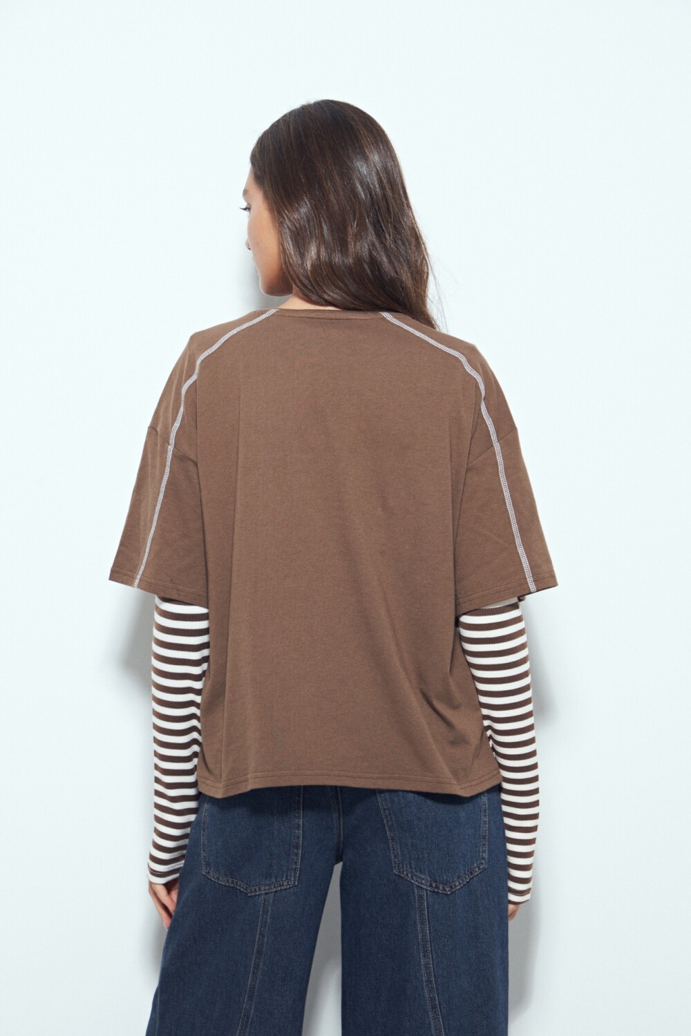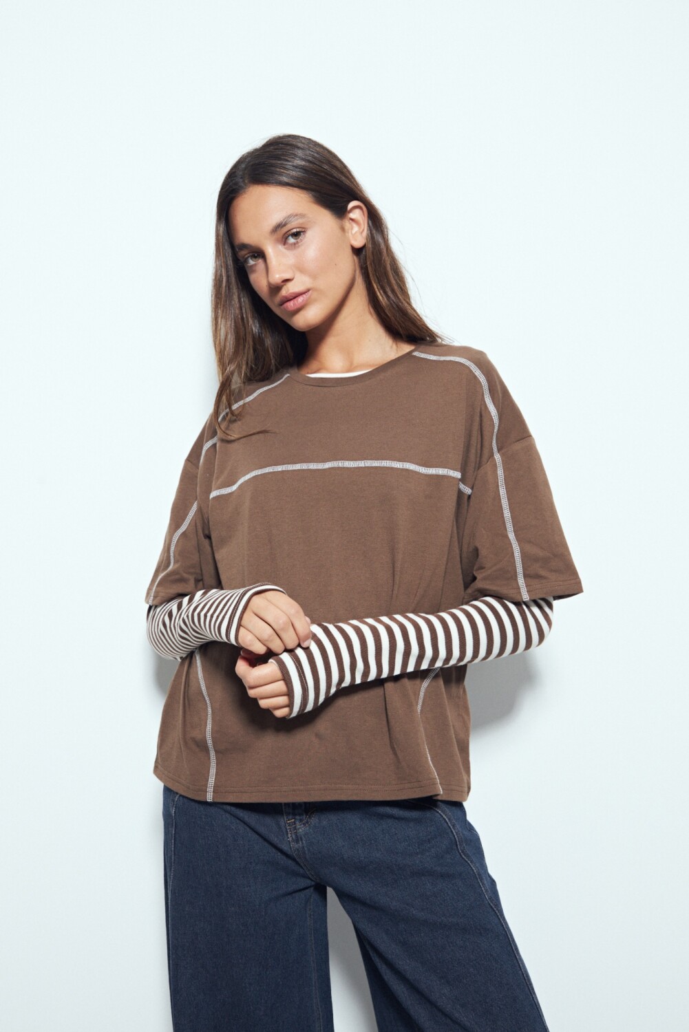 Remera de manga corta de silueta relajada con costuras a la vista que aportan un detalle moderno y diferencial. Su diseño de líneas simples se potencia con terminaciones en contraste que suman carácter sin perder versatilidad, ideal para armar looks en capas o llevar como pieza protagonista en outfits casuales y en tendencia.