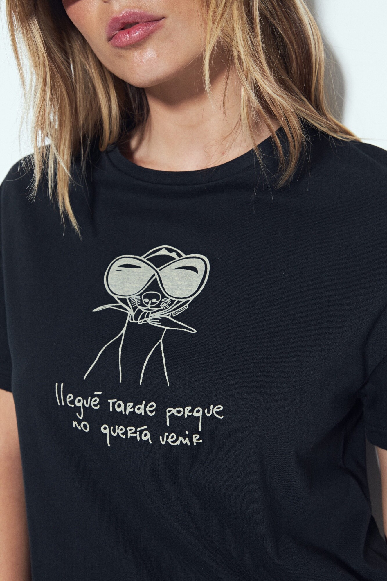 Remera de manga corta con estampa frontal, de silueta relajada y calce cómodo. El diseño gráfico suma un guiño irónico que aporta personalidad sin perder versatilidad, ideal para looks urbanos y descontracturados. Su tejido mezcla algodón con poliéster, logrando una textura suave al tacto, buena respirabilidad y mayor resistencia al uso diario. Una prenda funcional, canchera y clave para elevar cualquier look casual.