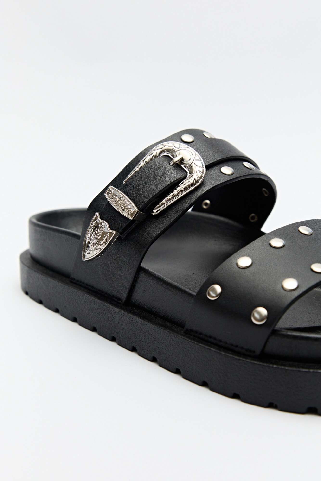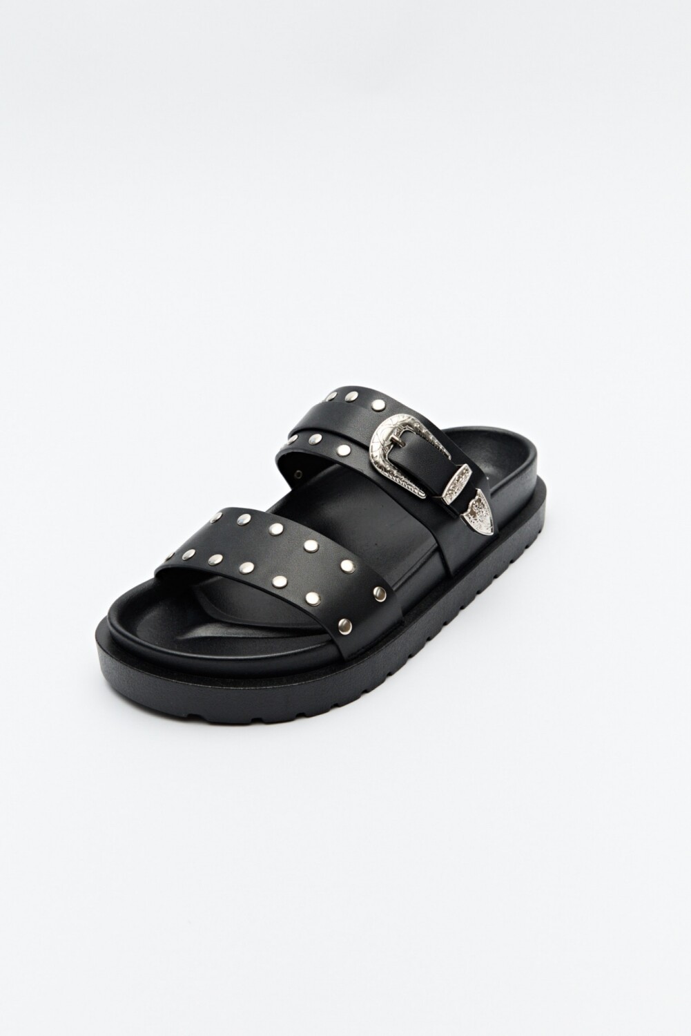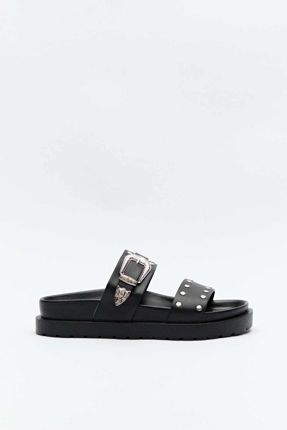 Sandalias de diseño urbano, con estética moderna y carácter marcado. Presentan doble tira con aplicaciones metálicas y hebilla protagónica que suma un guiño western, aportando personalidad y un aire trendy al diseño. La suela robusta garantiza comodidad y estabilidad para el uso diario, mientras que su silueta las convierte en una opción versátil para acompañar desde looks relajados hasta combinaciones más jugadas.
