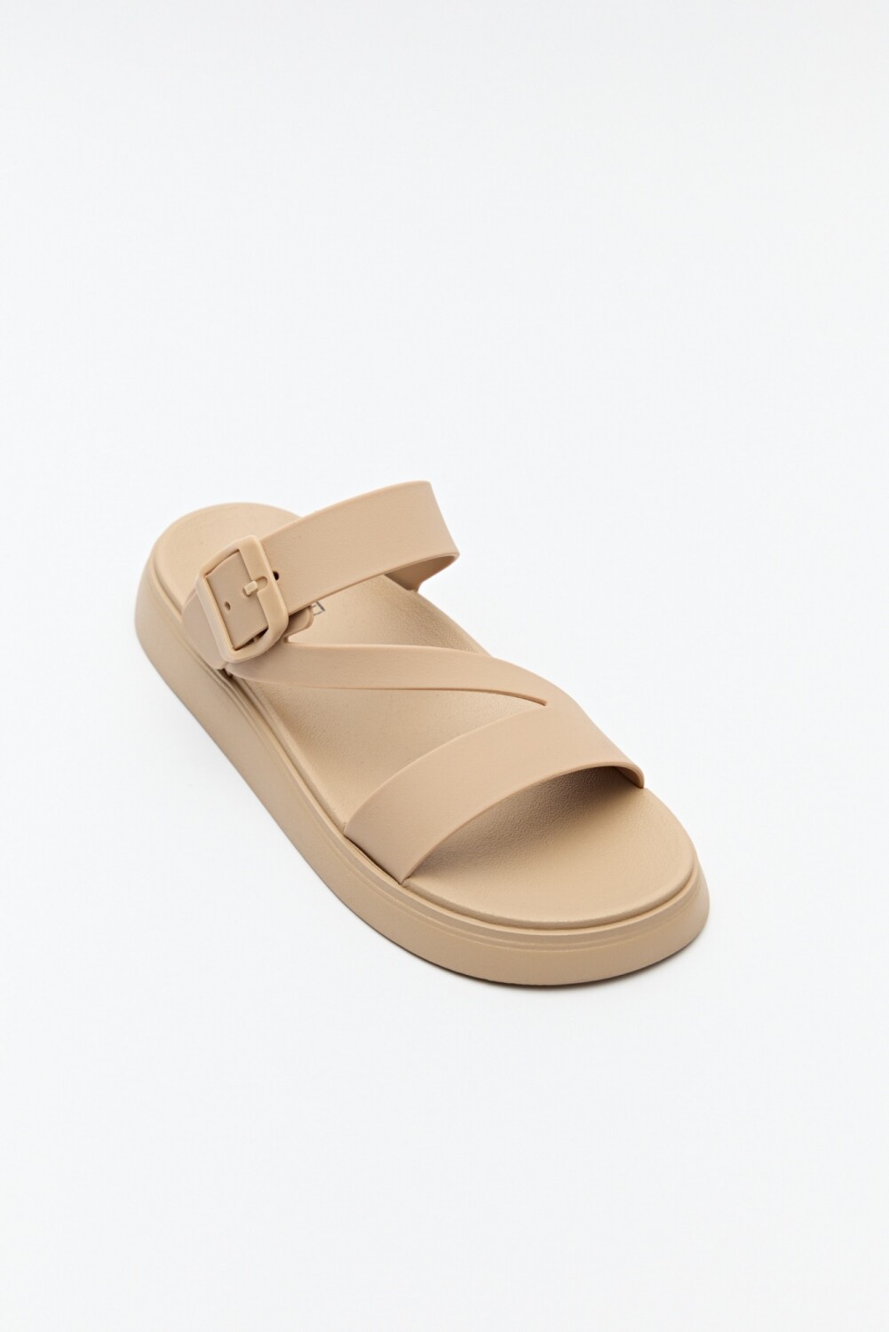 Sandalia con triple tira sobre el empeine y hebilla a tono.