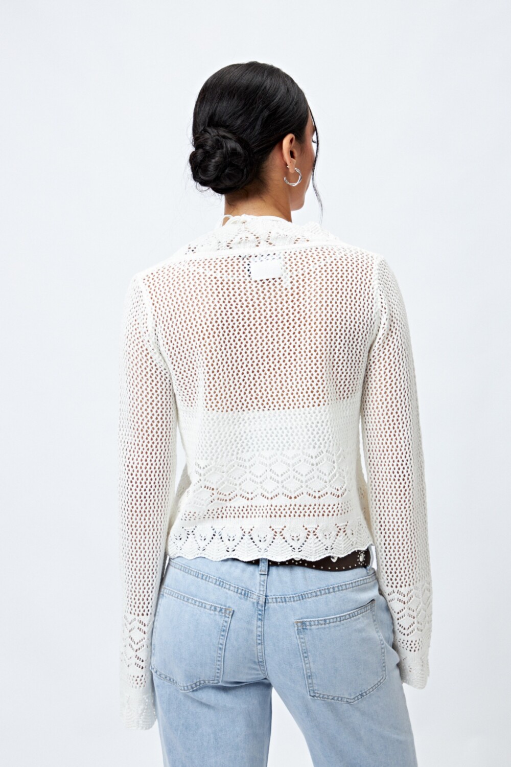 Trend alert: el tejido liviano se renueva en clave boho con este saquito calado. De manga larga y terminación acampanada, combina diferentes puntos de tejido que crean una textura artesanal y femenina. Su lazo frontal permite usarlo cerrado o abierto sobre tops o vestidos, sumando un toque relajado pero con estilo. Perfecto para looks de día o para elevar un outfit de playa o festival.