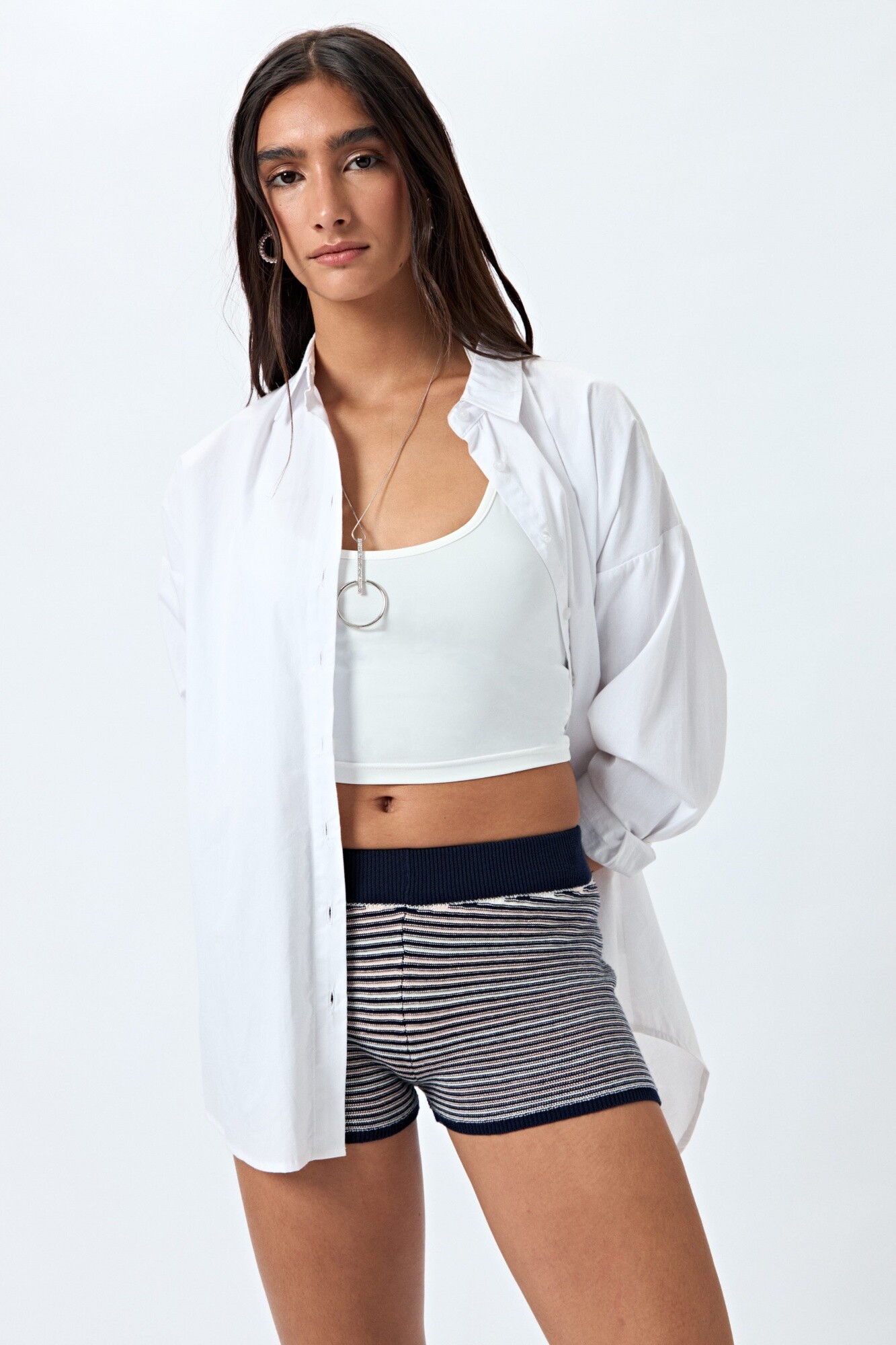 Short tejido con diseño rayado y cintura ancha elastizada que aporta comodidad y sujeción. Su textura de punto 100% algodón ofrece un tacto suave y natural, ideal para los días de verano.