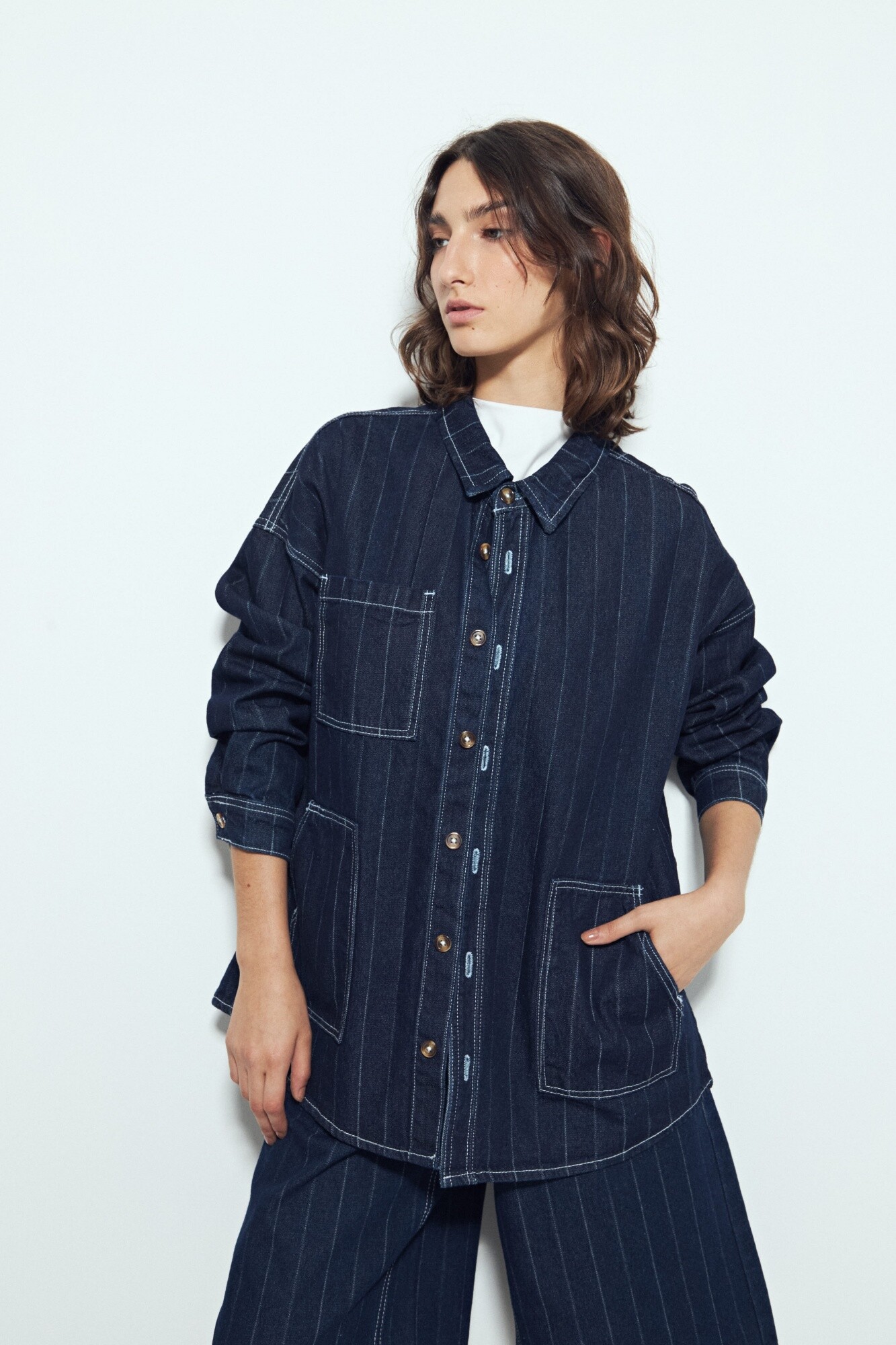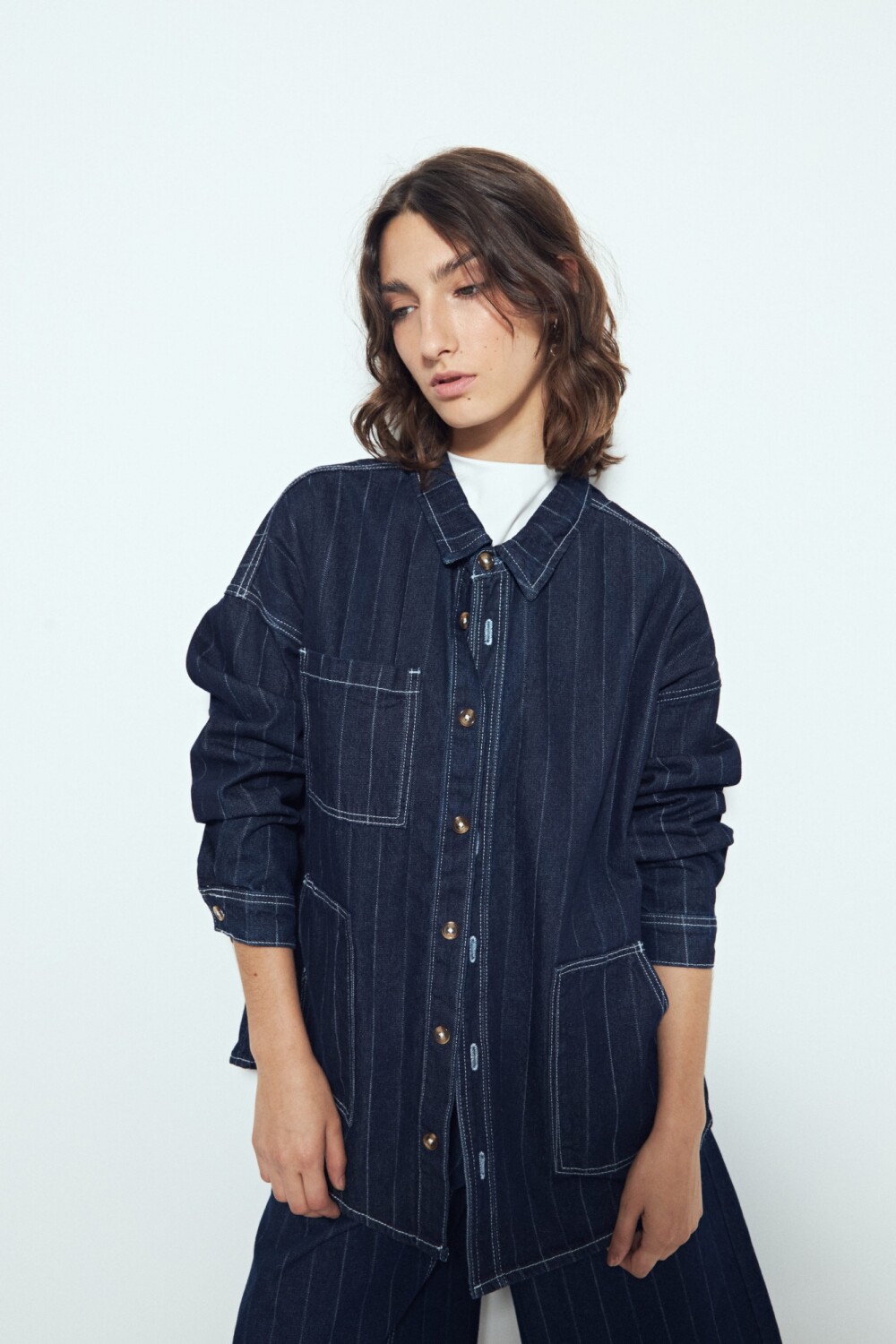 Sobrecamisa de jean a rayas con silueta relajada y espíritu urbano, pensada para sumar capas con actitud. Su denim de mano firme aporta estructura, mientras las rayas verticales estilizan y refuerzan ese mix perfecto entre lo trendy y lo atemporal. Una pieza versátil que funciona tanto abierta como protagonista del look, ideal para armar conjuntos con impronta moderna y sin esfuerzo.