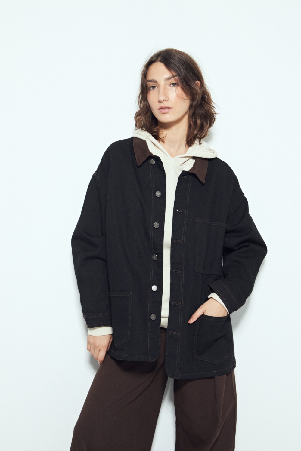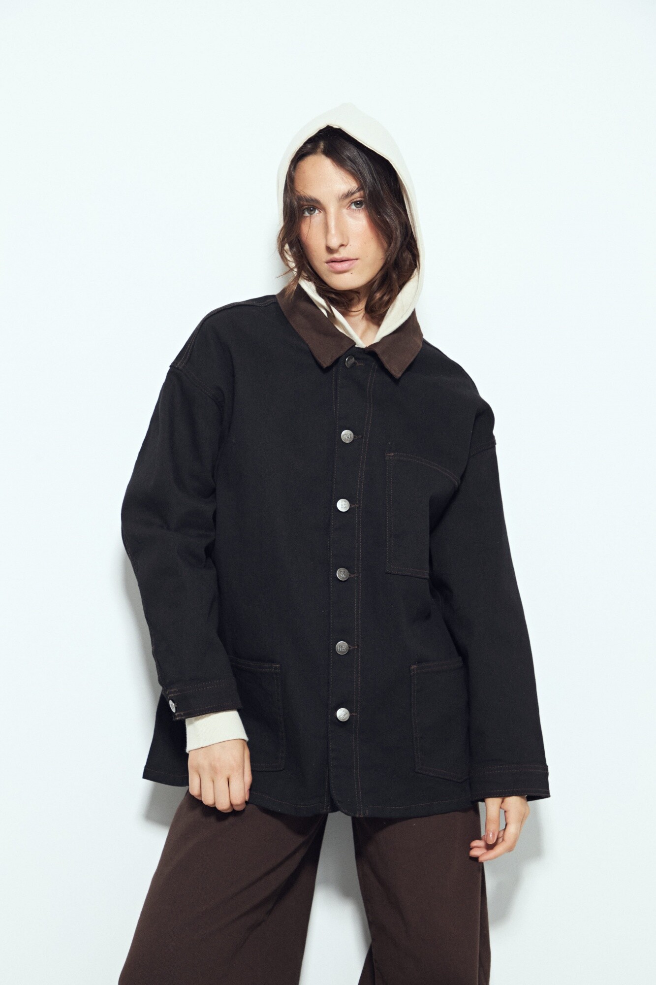 Campera tipo Barn Jacket, de algodón con elastano de silueta relajada y estructura firme, pensada para sumar capas sin perder estilo. Presenta cierre frontal con botones metálicos, bolsillos aplicados y pespuntes visibles que realzan el diseño y aportan un guiño utilitario en tendencia. Un ítem versátil, ideal para acompañar looks urbanos y elevar conjuntos cotidianos con un aire actual.