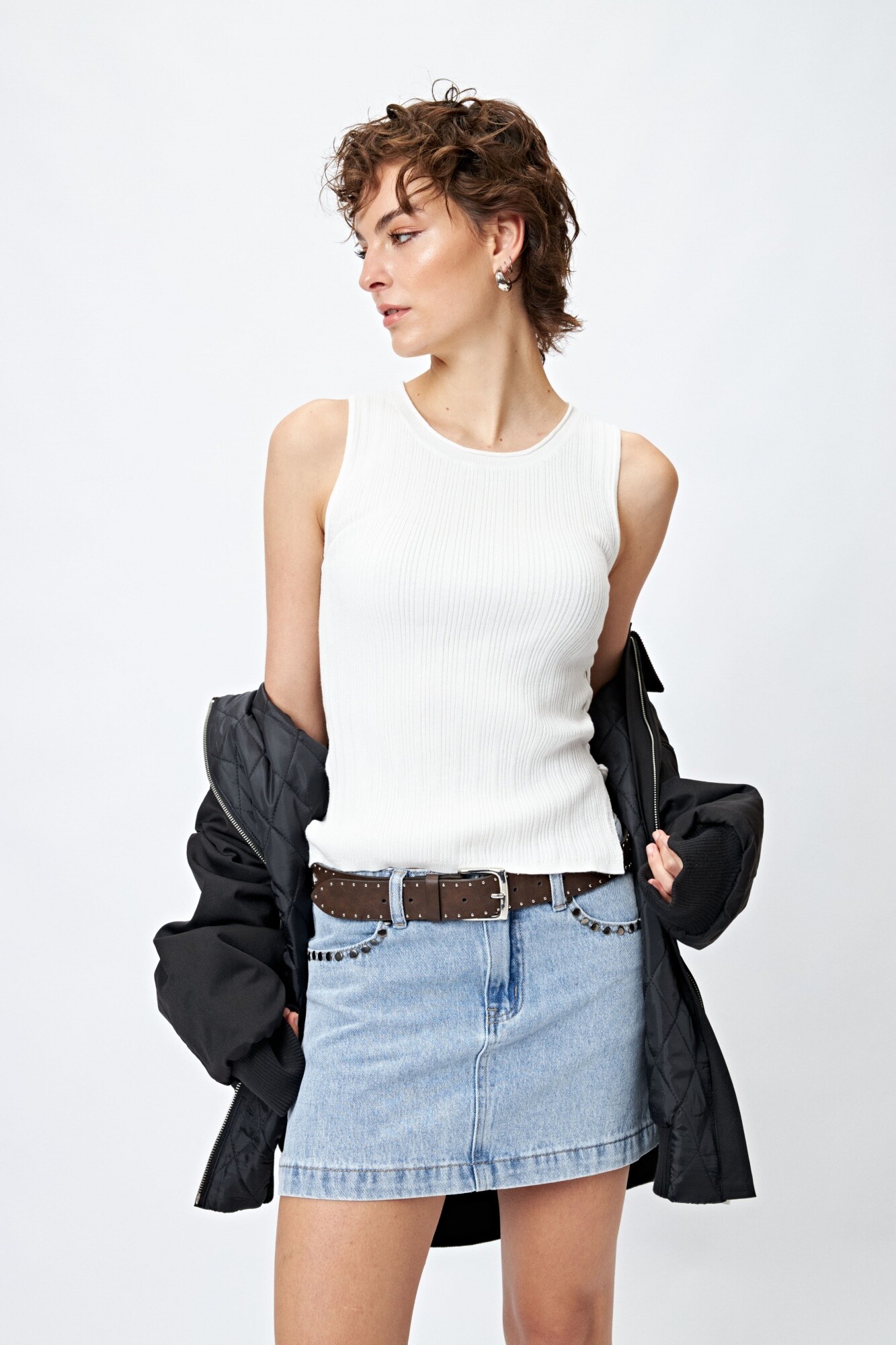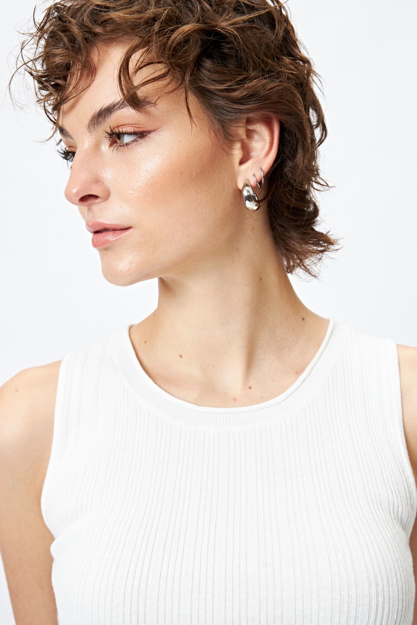 Top tejido sin mangas con textura acanalada y detalle de trenzado lateral ajustable, que aporta un toque distintivo y femenino al diseño. Su silueta ceñida realza la figura, mientras que el tejido suave y liviano lo convierte en una prenda versátil para usar sola o en capas.