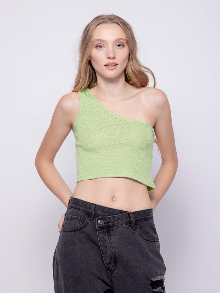 Top asimétrico tejido multicolor. Cuenta con un solo hombro y pequeños calados.