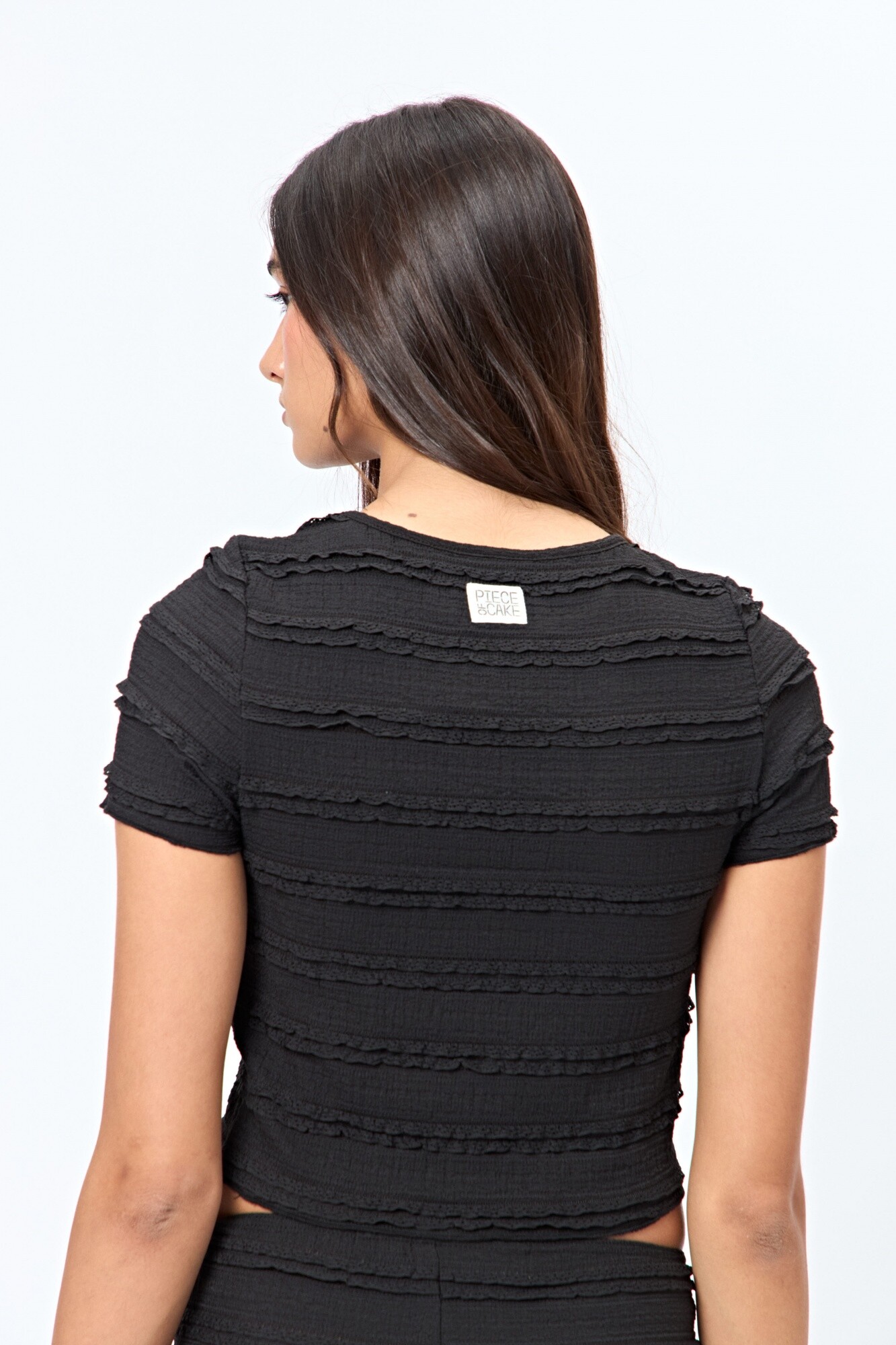 Top de manga corta con tejido elástico y textura rayada, que combina transparencias sutiles con un acabado artesanal. Su calce al cuerpo y largo crop lo convierten en una prenda clave para un look de noche. Ideal para combinar con el microshort a juego o la falda.