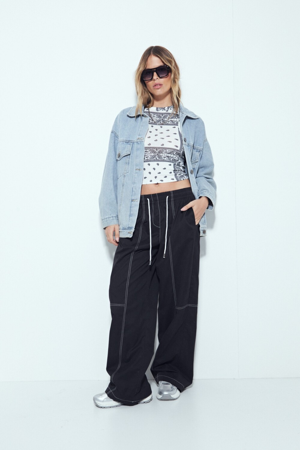 Top crop sin mangas confeccionado en tejido con elasticidad, que se adapta al cuerpo y define la silueta de forma cómoda. El diseño presenta estampa tipo bandana con inspiración gráfica, aportando un aire urbano y actual. El cuello cerrado y las sisas bien definidas equilibran el largo crop, logrando una prenda protagonista y versátil, ideal para combinar con prendas de tiro alto y clave para elevar cualquier look con actitud.