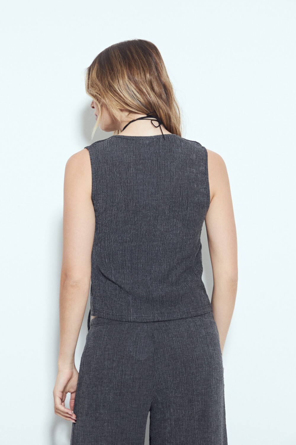 Top cruzado sin mangas con escote en V, una prenda de diseño cuidado que combina comodidad y estilo. El frente cruzado con lazo lateral permite regular el calce y aporta un detalle distintivo que estiliza la silueta. Su textura suave y flexible acompaña el cuerpo con naturalidad, ideal para usar solo o en conjunto con el pantalón de la misma línea.