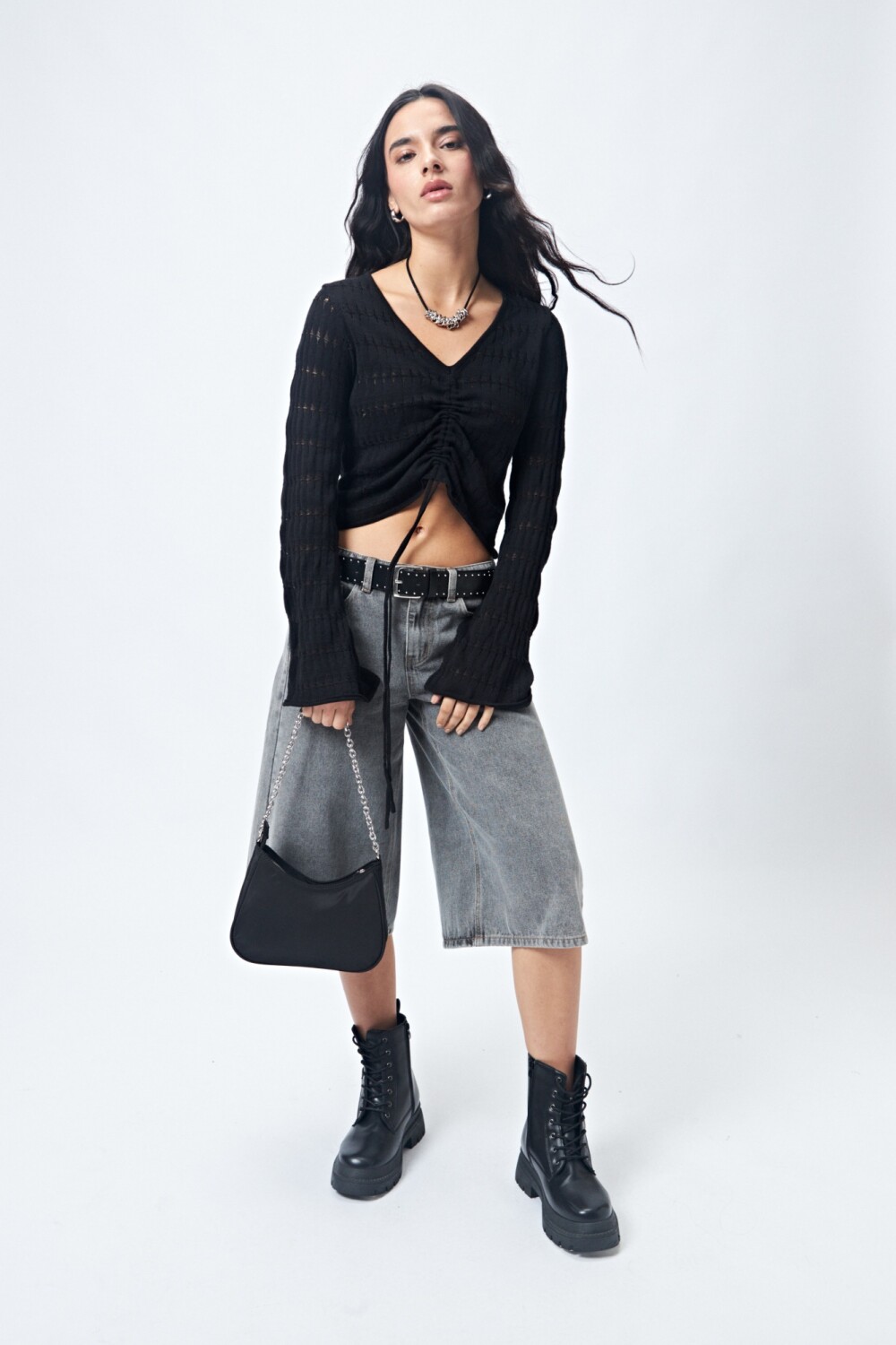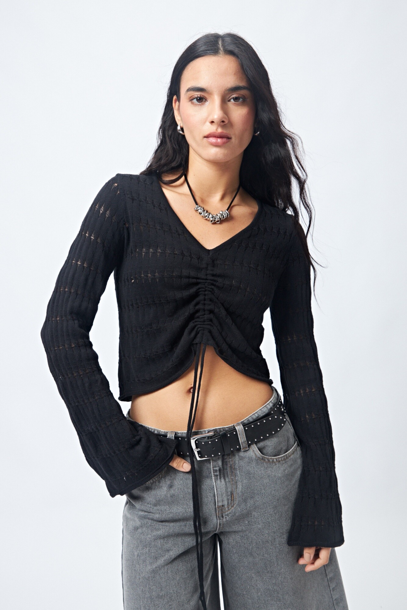 Un diseño que combina lo delicado con lo trendy. Este top tejido presenta una trama calada con sutil transparencia y escote en “V”, acompañado de un frunce central regulable que permite ajustar el largo y realzar la silueta. Las mangas acampanadas le suman un aire romántico, mientras que su textura liviana lo convierte en una opción ideal para looks de entretemporada o para superponer sobre tops al tono.