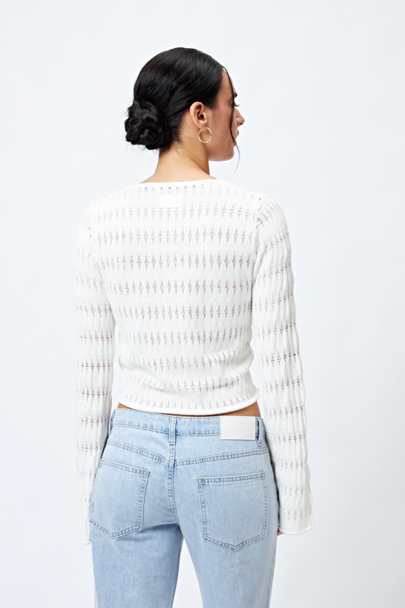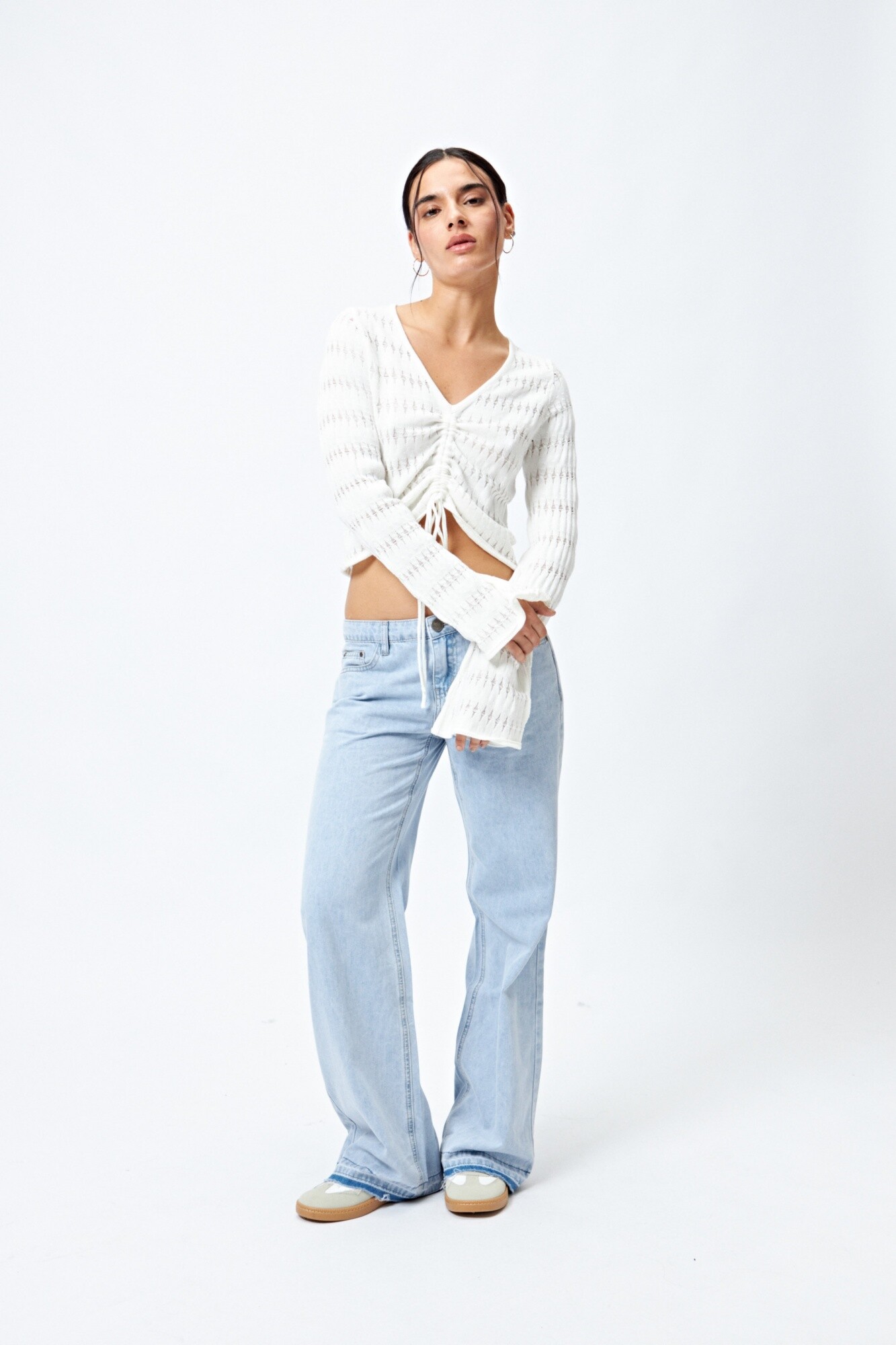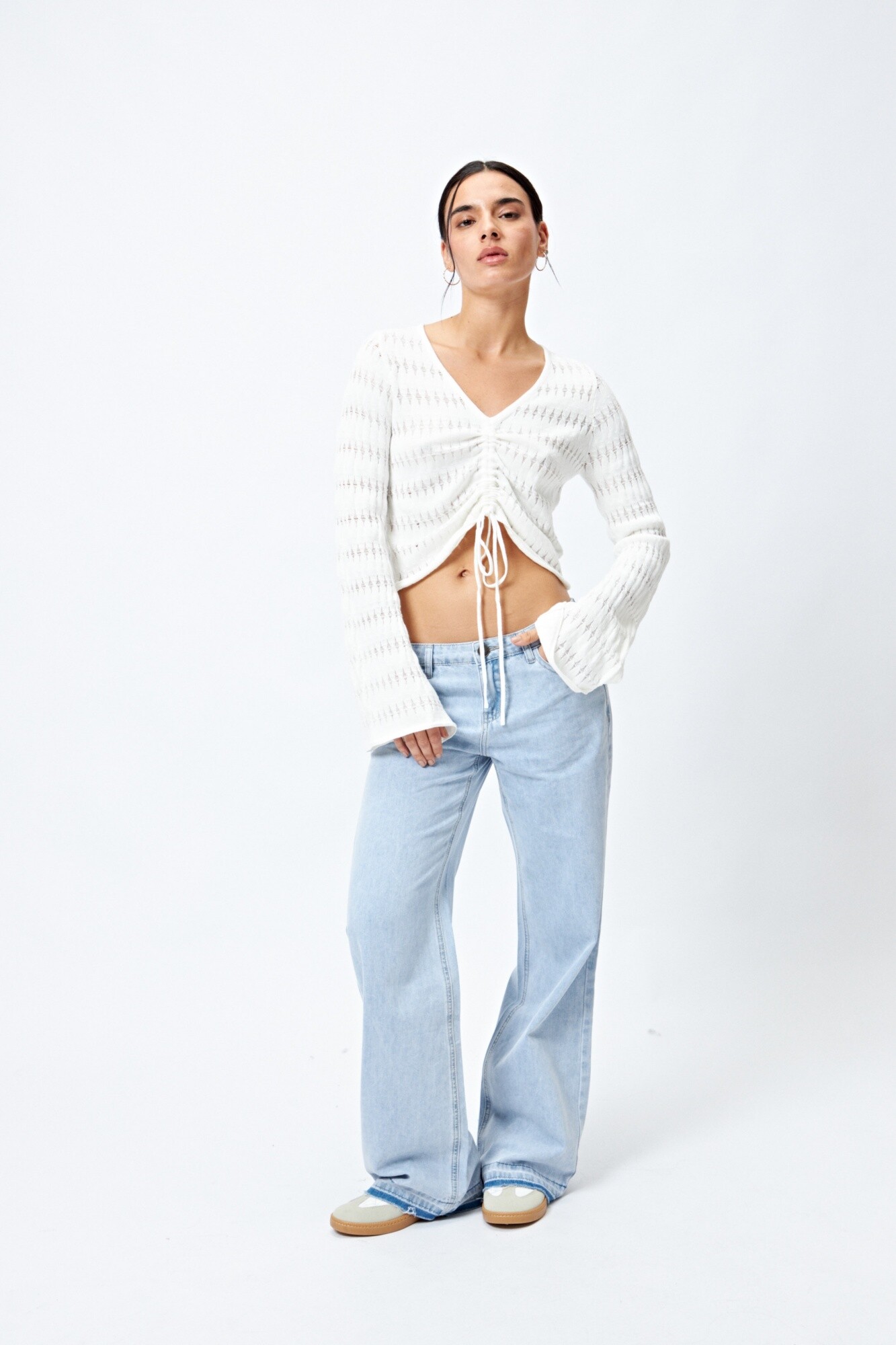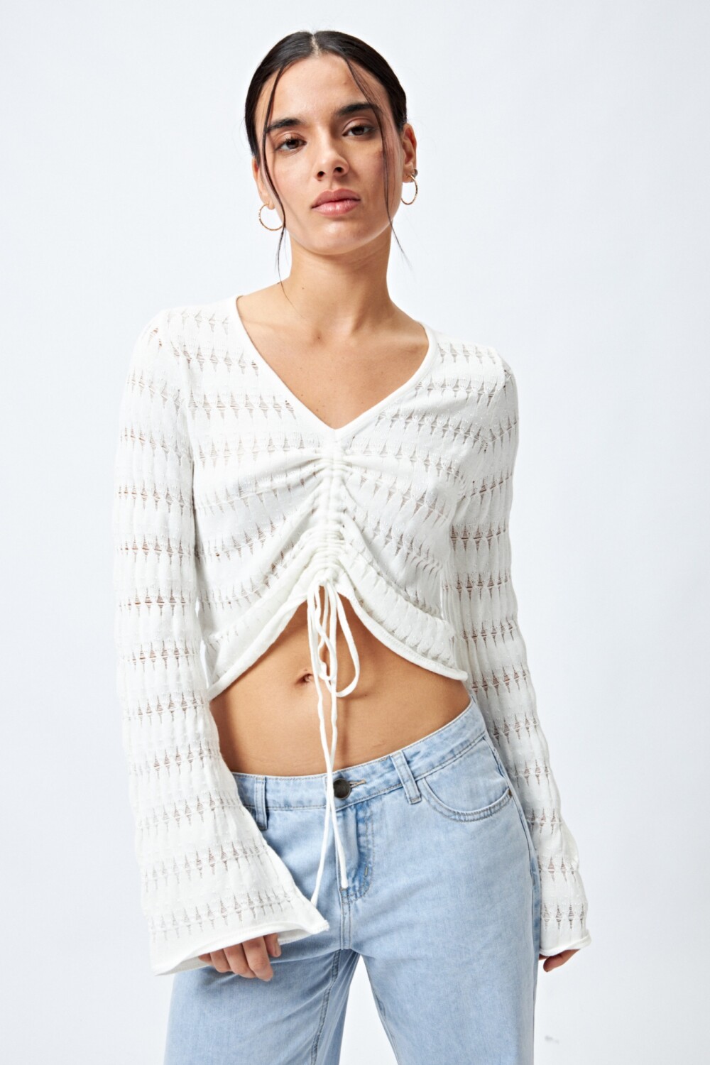 Un diseño que combina lo delicado con lo trendy. Este top tejido presenta una trama calada con sutil transparencia y escote en “V”, acompañado de un frunce central regulable que permite ajustar el largo y realzar la silueta. Las mangas acampanadas le suman un aire romántico, mientras que su textura liviana lo convierte en una opción ideal para looks de entretemporada o para superponer sobre tops al tono.