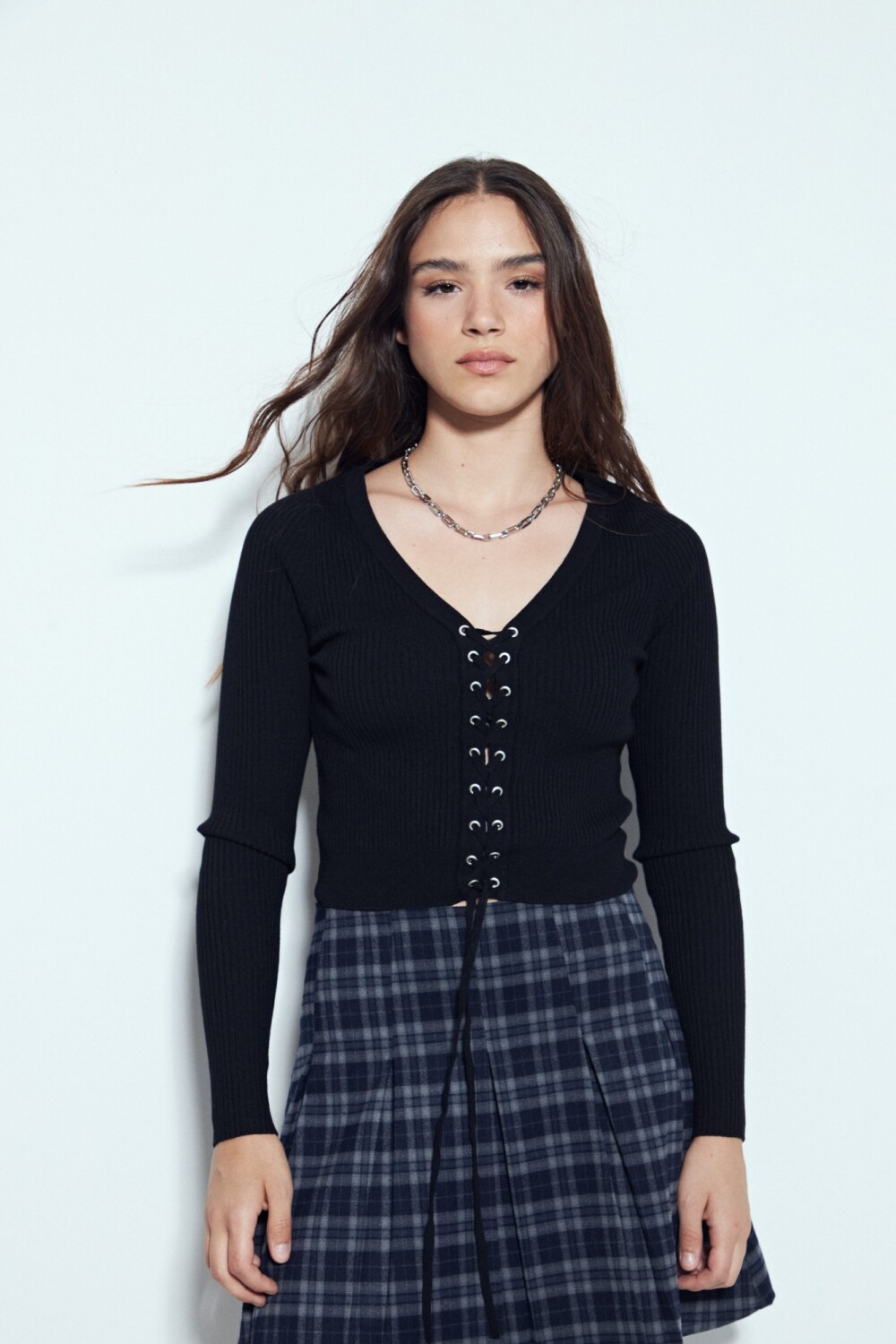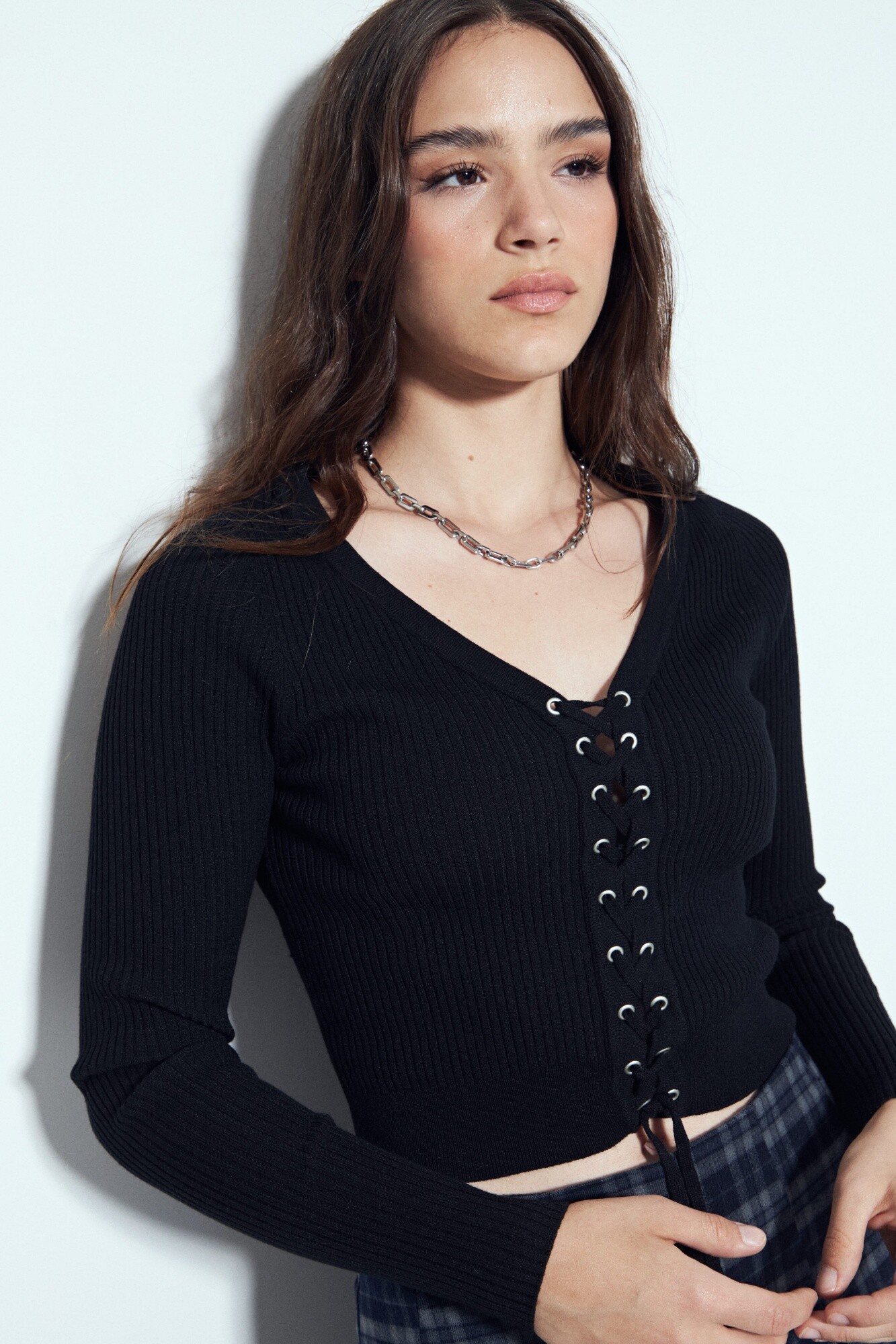Top tejido de manga larga con escote en V y detalle de cordones regulables en el frente, que aportan un guiño distintivo y moderno al diseño. Su tejido acanalado acompaña la silueta con una caída suave, logrando un equilibrio entre ajuste y confort. Ideal para sumar personalidad a looks urbanos o más arreglados, es una prenda en tendencia y clave para elevar cualquier look sin esfuerzo.