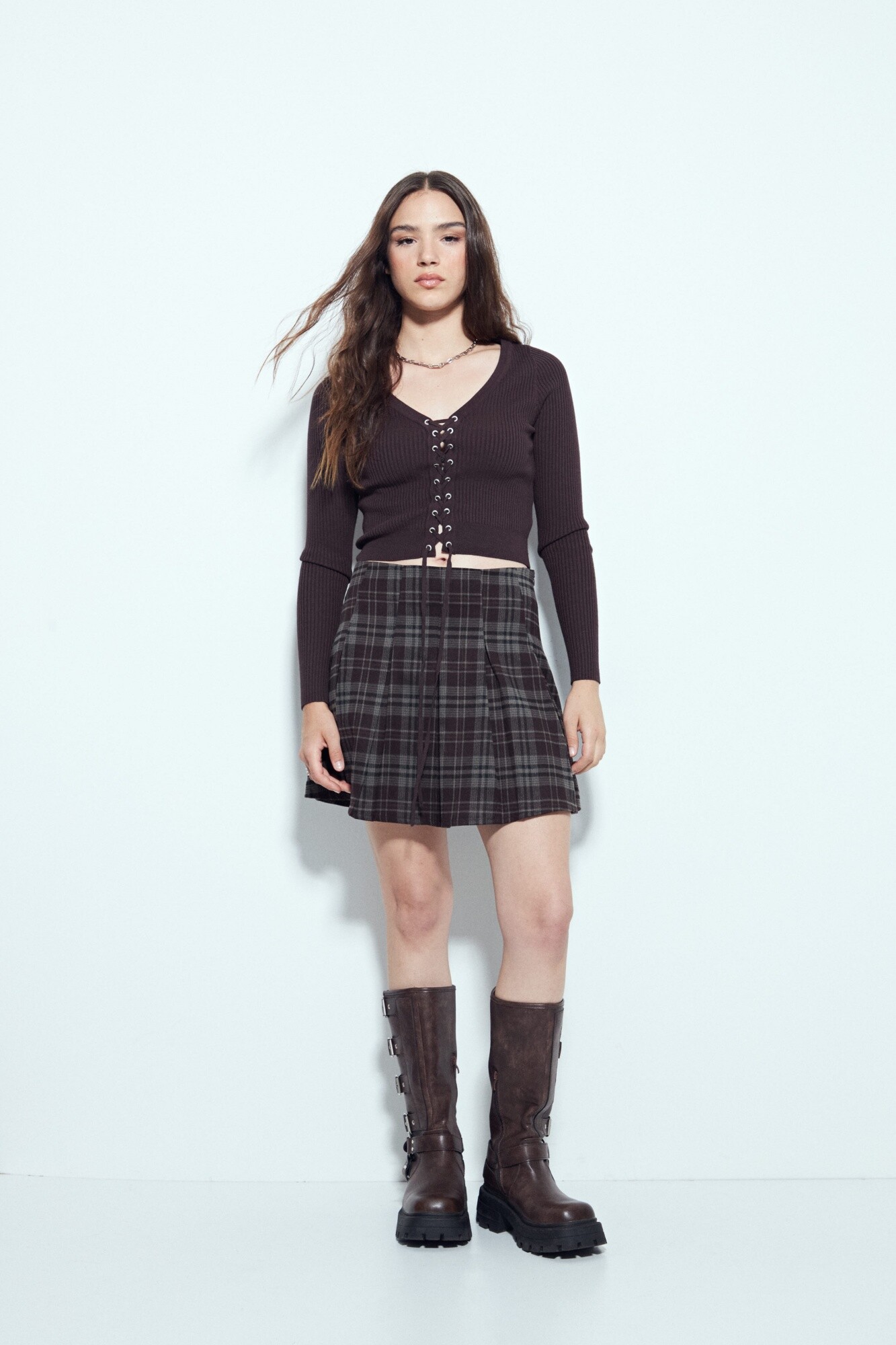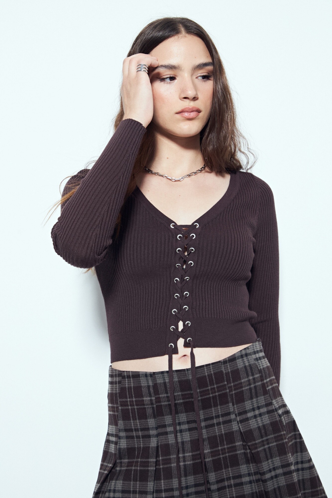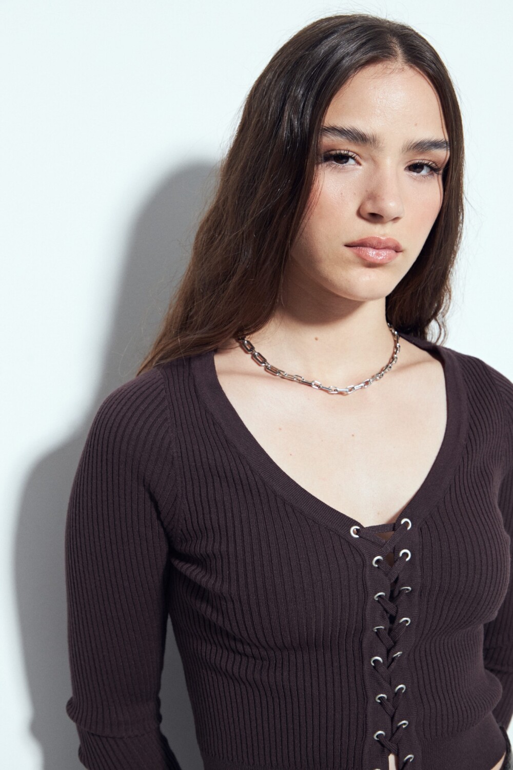 Top tejido de manga larga con escote en V y detalle de cordones regulables en el frente, que aportan un guiño distintivo y moderno al diseño. Su tejido acanalado acompaña la silueta con una caída suave, logrando un equilibrio entre ajuste y confort. Ideal para sumar personalidad a looks urbanos o más arreglados, es una prenda en tendencia y clave para elevar cualquier look sin esfuerzo.