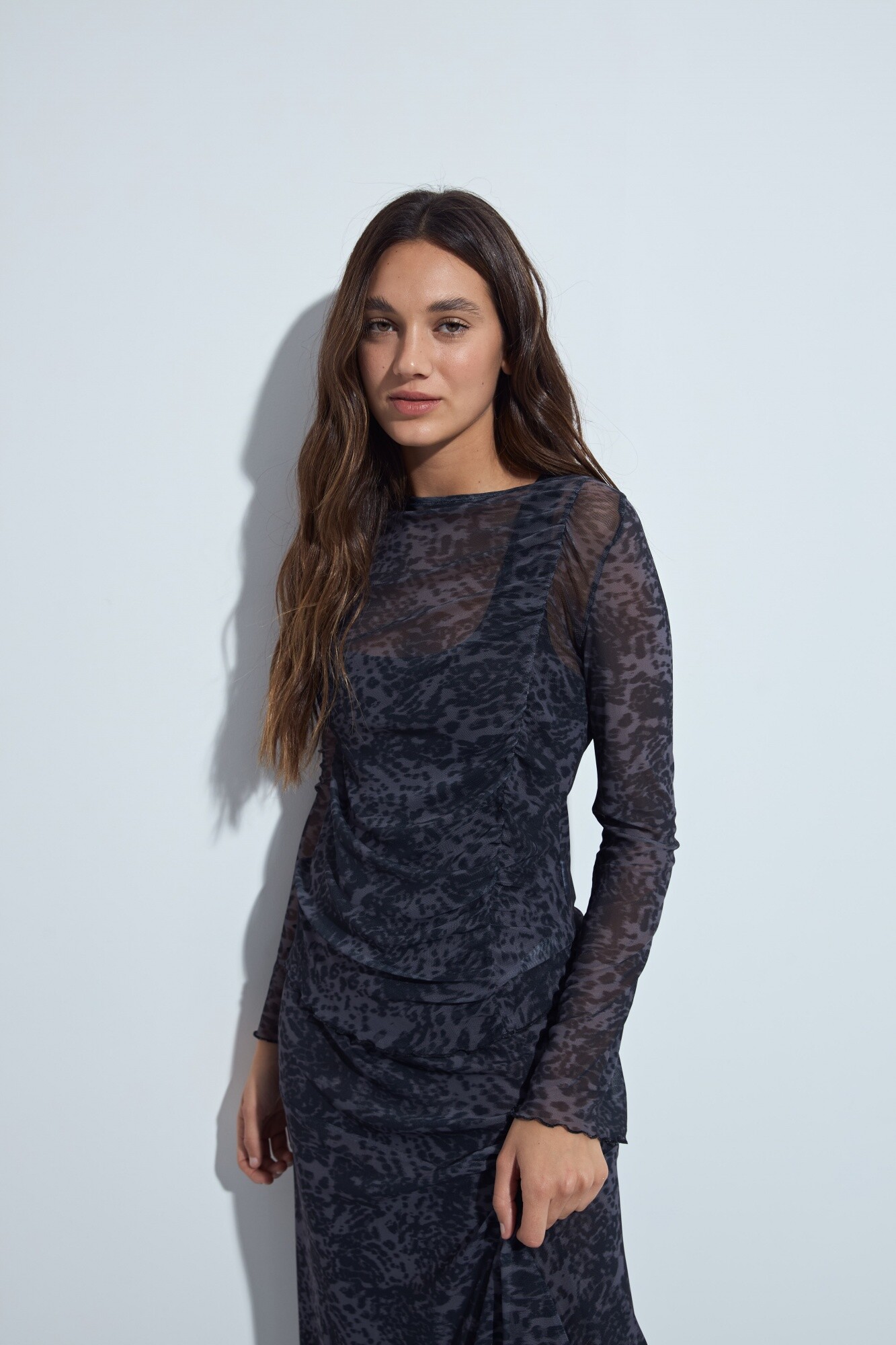 Top de manga larga estampado, una prenda protagonista que aporta textura y estilo al look. El diseño entallado y el tejido elástico se adaptan al cuerpo con comodidad, mientras que el efecto drapeado suma movimiento y un calce favorecedor. Ideal para combinar con su falda a juego o llevar con prendas lisas para un outfit más equilibrado.