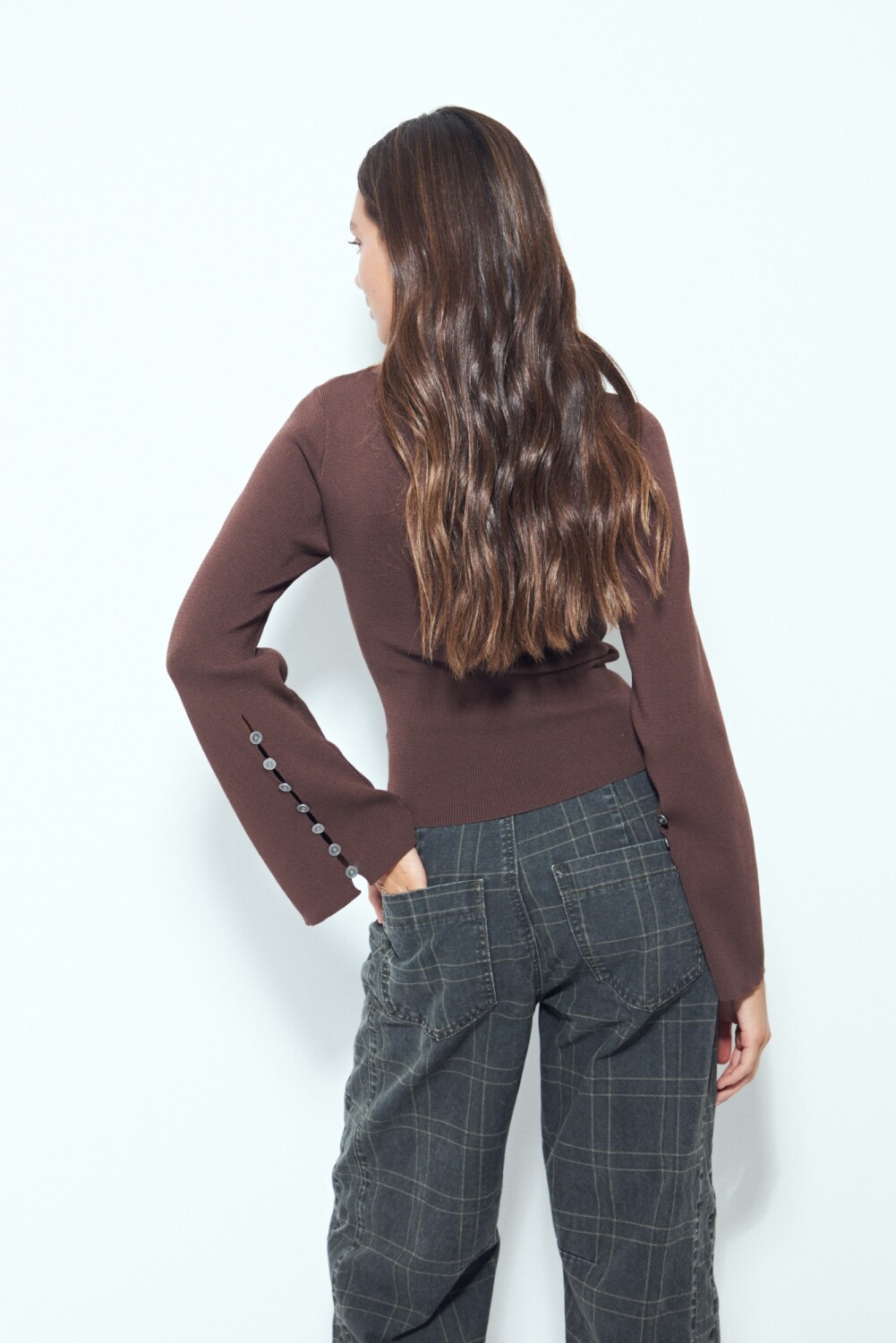 El diseño se destaca por su escote redondo clásico y por el detalle de botones en los puños, que amplían levemente la manga generando un efecto sutil y femenino. Una prenda versátil, ideal para combinar con denim, sastrería o faldas y lograr un look equilibrado, en tendencia y fácil de adaptar del día a la noche.