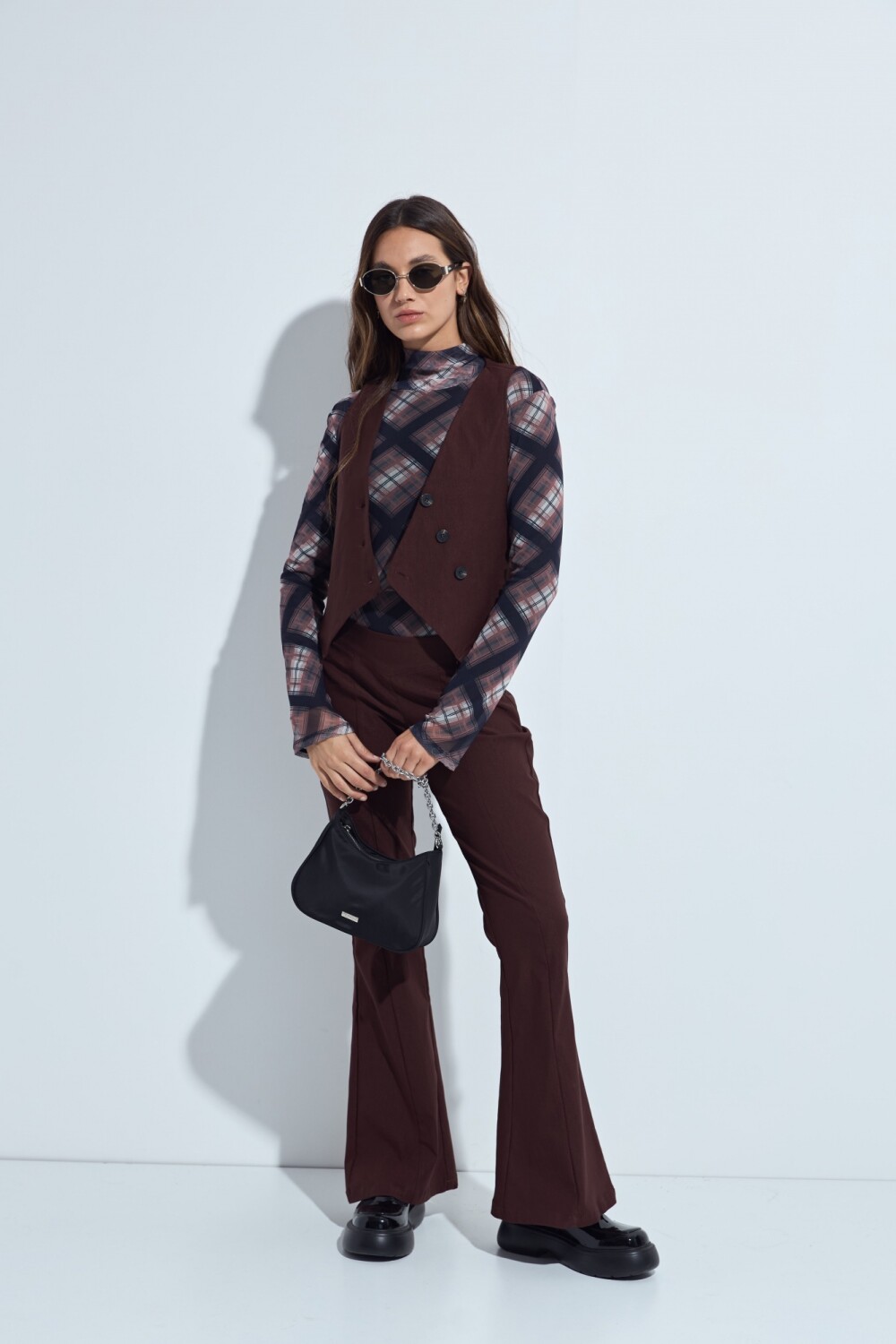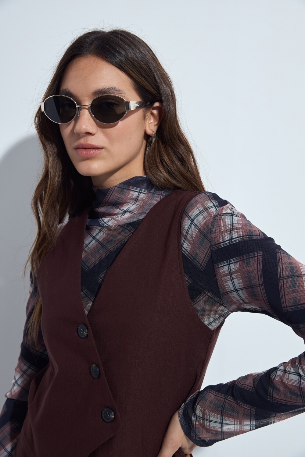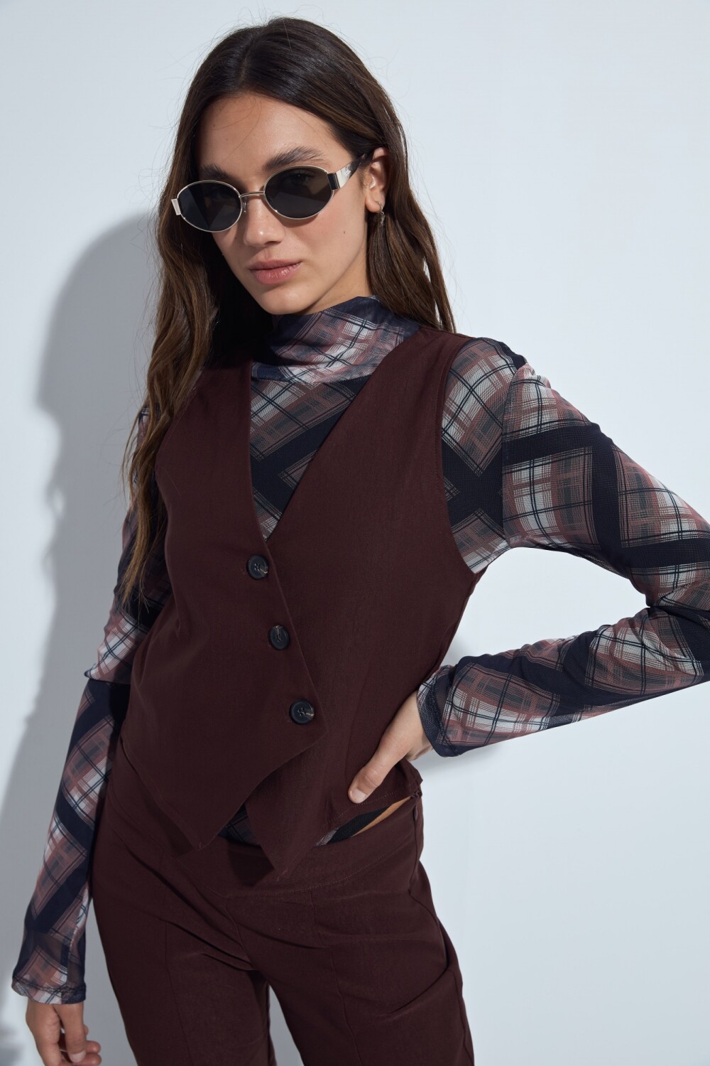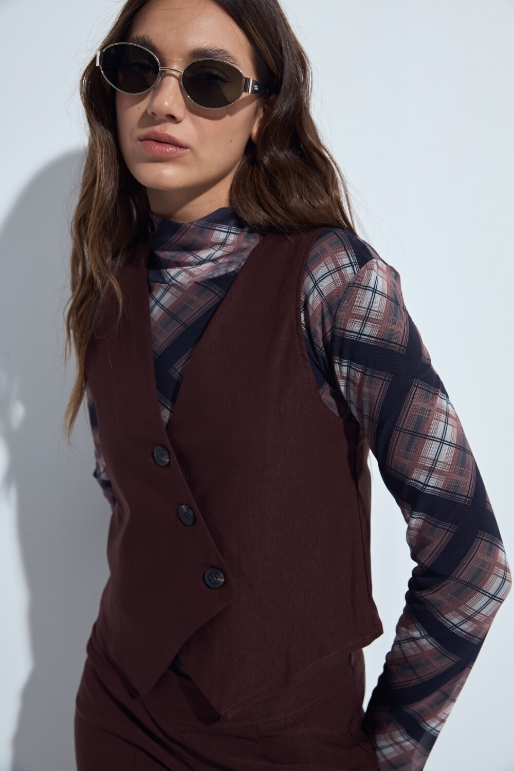Top tipo chaleco con escote en V y frente abotonado que aporta un aire sastrero moderno. De calce entallado, es una prenda versátil que se adapta tanto a looks formales como a combinaciones más relajadas, ideal para sumar estructura y estilo sin perder comodidad.