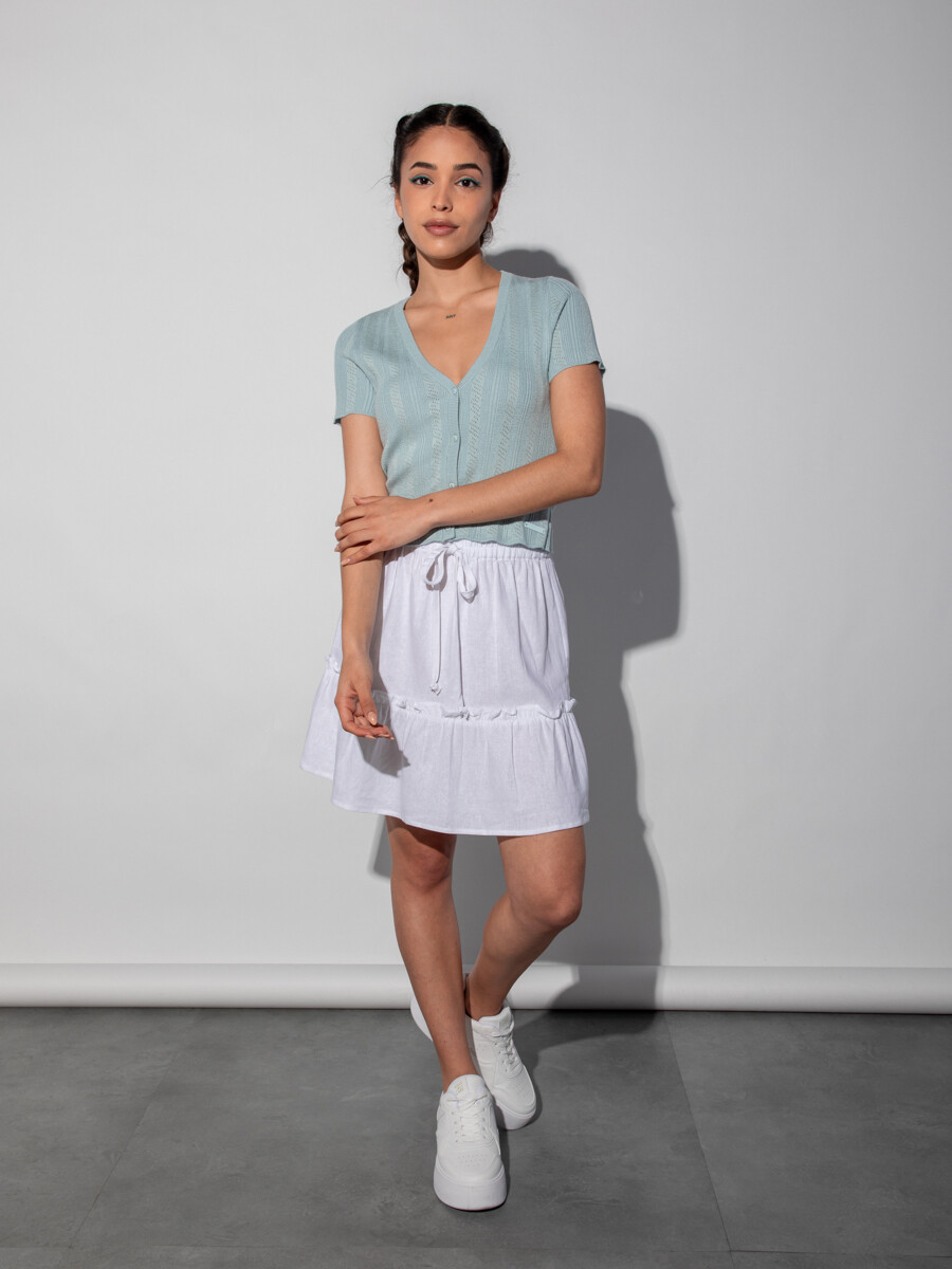 Top estampado de tela fluida con tirantes finos. Cuenta con tiras en los laterales.