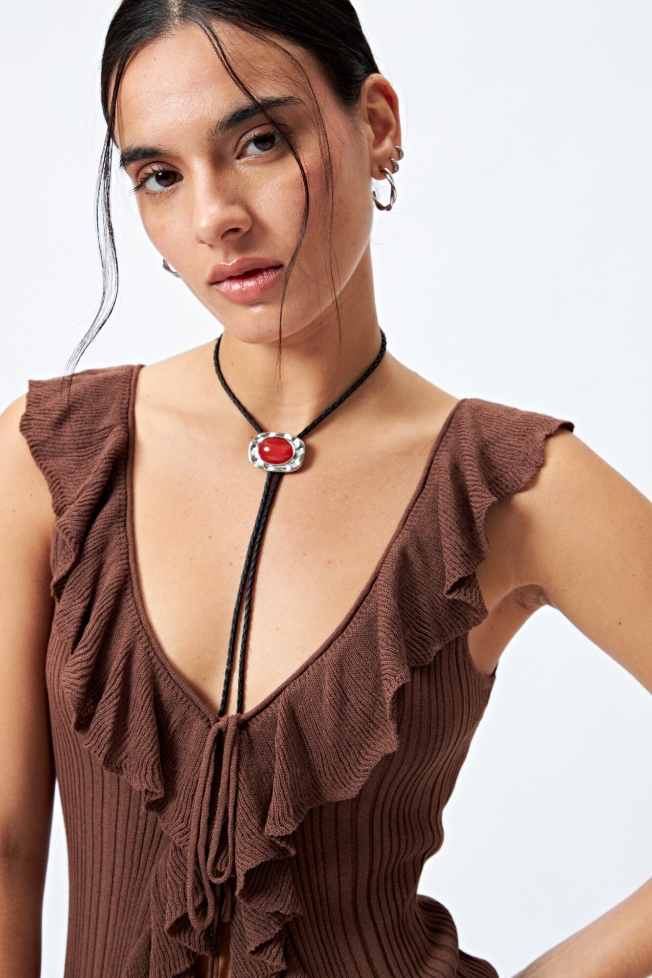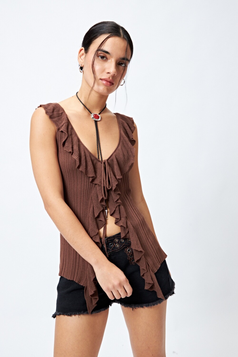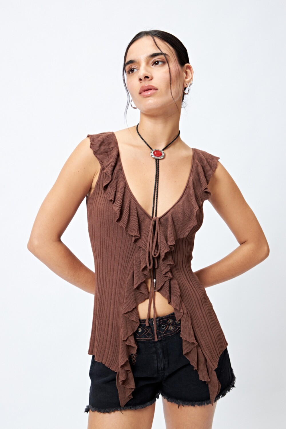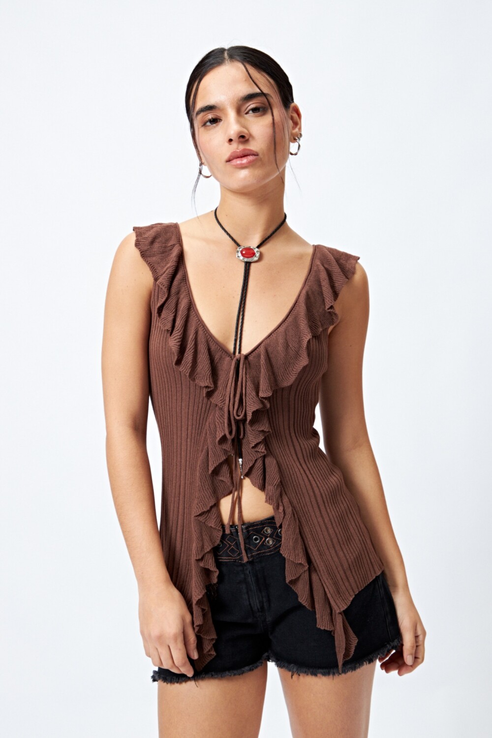 Top tejido sin mangas con escote profundo y volados que recorren todo el frente, aportando movimiento y un toque romántico. El lazo central permite regular la apertura, mientras que su punto acanalado realza la silueta y suma textura. Una prenda femenina y actual, ideal para combinar con denim o shorts para un look de verano en tendencia.