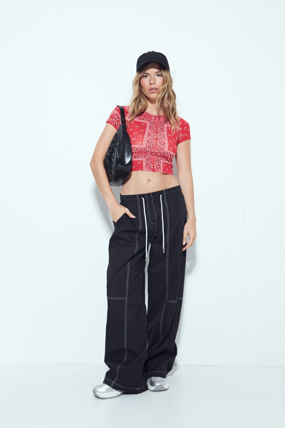 Top crop de manga corta confeccionado en tejido con elasticidad, que se ajusta al cuerpo de forma cómoda y define la silueta. El diseño presenta estampa tipo bandana de inspiración gráfica, aportando carácter y un guiño urbano que lo convierte en una pieza protagonista. Ideal para combinar con prendas de tiro alto y lograr looks con actitud, es clave para elevar cualquier look desde un ítem de fuerte identidad.
